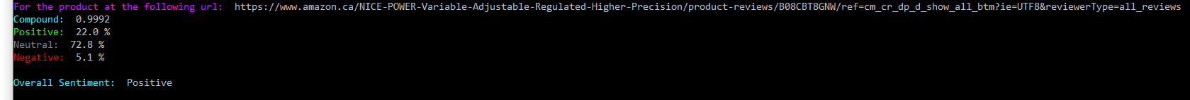 It webscrapes reviews from Amazon, translate any review where necessary to English (autodetection of language via googletrans) and cleans up the data and determines the sentiment score to let the user know if it is a good product or not. And displays results in terminal with colors