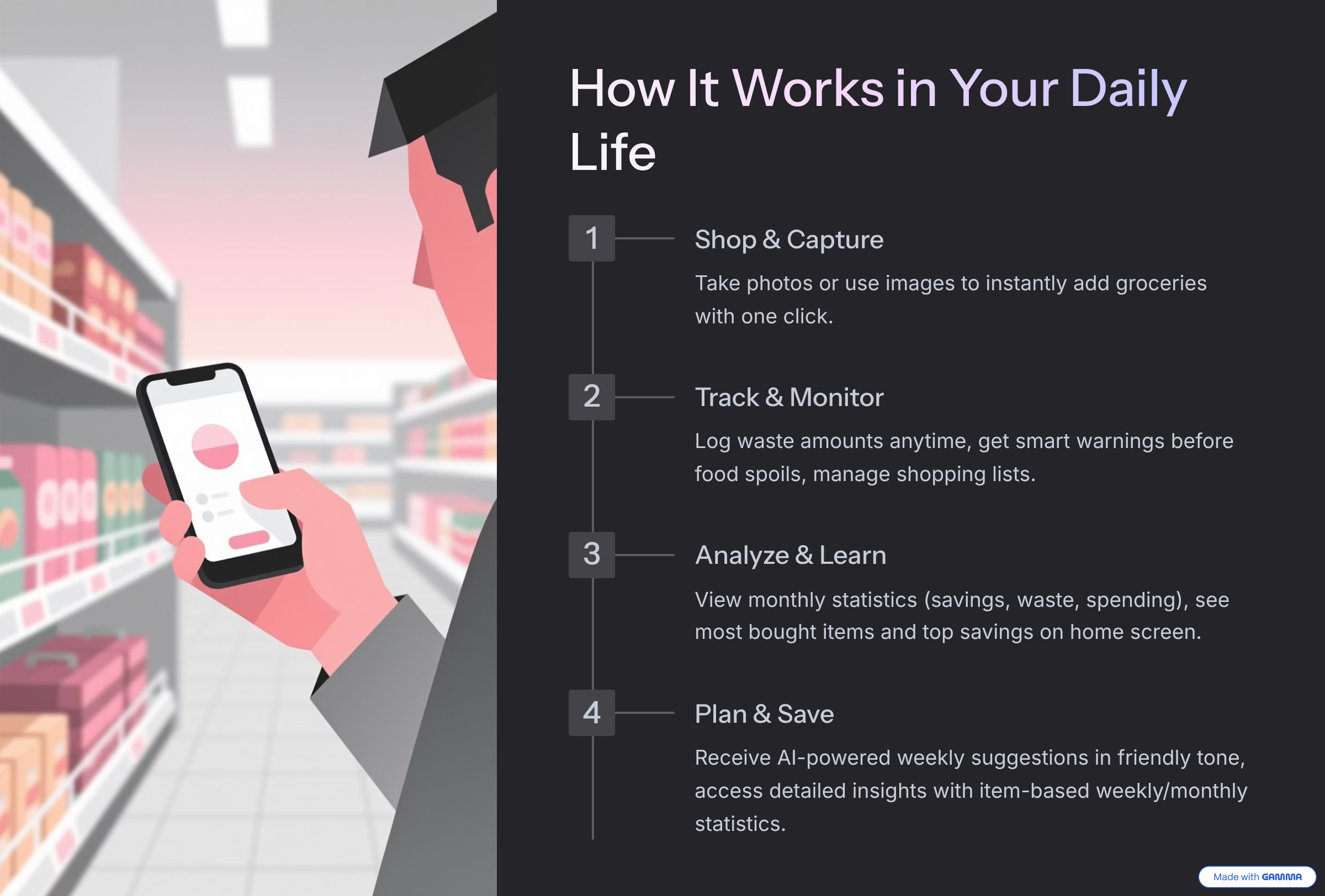 We built a working prototype that combines real-time recognition, prediction, and reasoning in one clean interface. It transforms everyday grocery shopping into a sustainable, data-driven experience that directly reduces waste and saves money. The system now runs smoothly, intelligently connecting AI models in a minimal, practical form.
