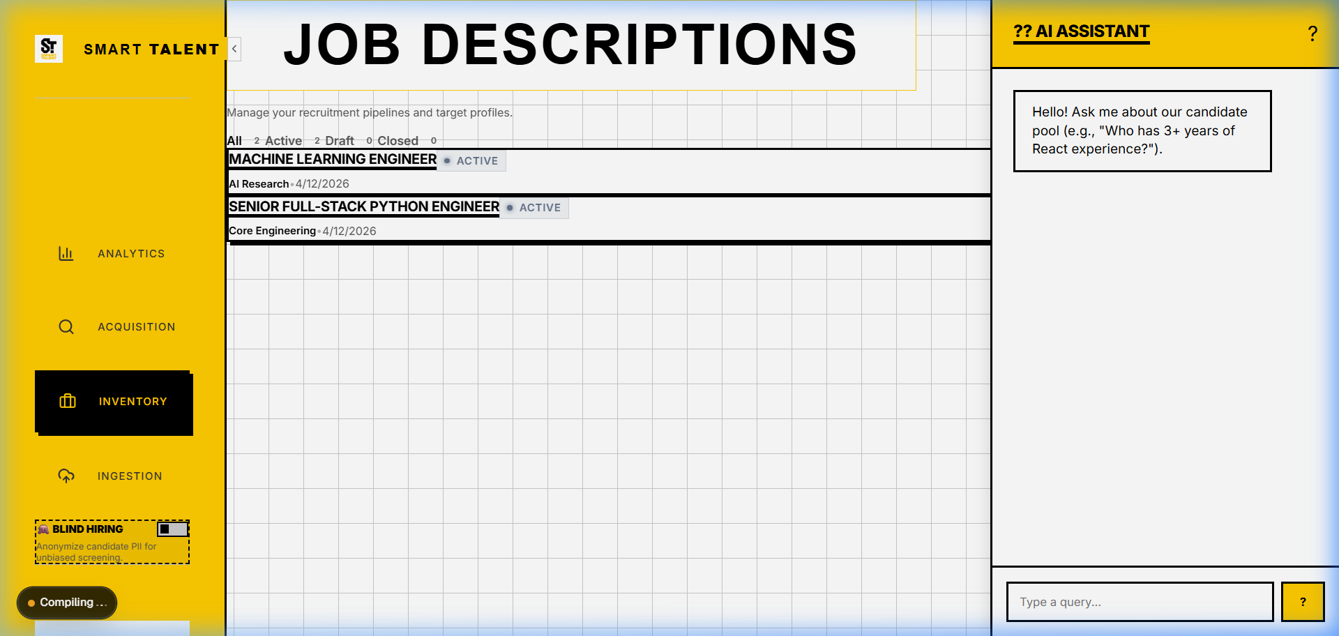 Active pipeline hub with Explainable AI (XAI). Ranks candidates via 1536-dim vector similarity while enforcing PII-redacted blind hiring.