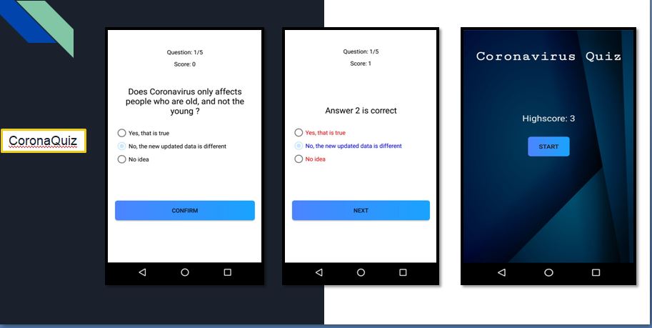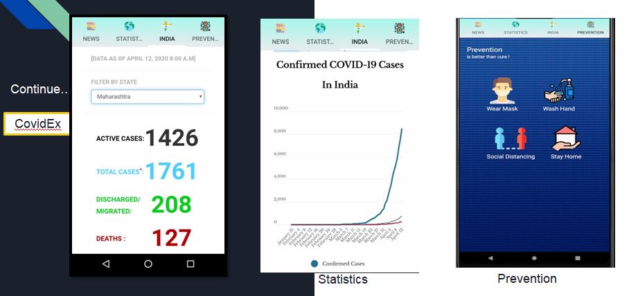 CoronaEx Section - This section having following sub components: • News tab: Having latest new updates. Fake news seems to be spreading just as fast as the virus but as we have integrated from official sources so everyone will be aware from fake news. • World Statistic tab: Real-time Dashboard that tracks the recent cases of covid-19 across the world. • India Statistic tab: Coronavirus cases across different states in India with relevant death and recovered cases. • Prevention tab: Some Prevention to be carried out in order to defeat corona. CoronaQuiz section - quiz that will help people know about the Corona virus and its effects on human body. It chooses random questions and show the correct answer for the questions and at the end user will get to know their highest score. Helpline Section - As this application particularly made for Indian citizen to use, all state helpline number of India included. Chatbot Section - A self-assisted bot made for the people navigate corona virus situation. Common Questions: Start screening,what is COVID-19? , What are the symptoms?