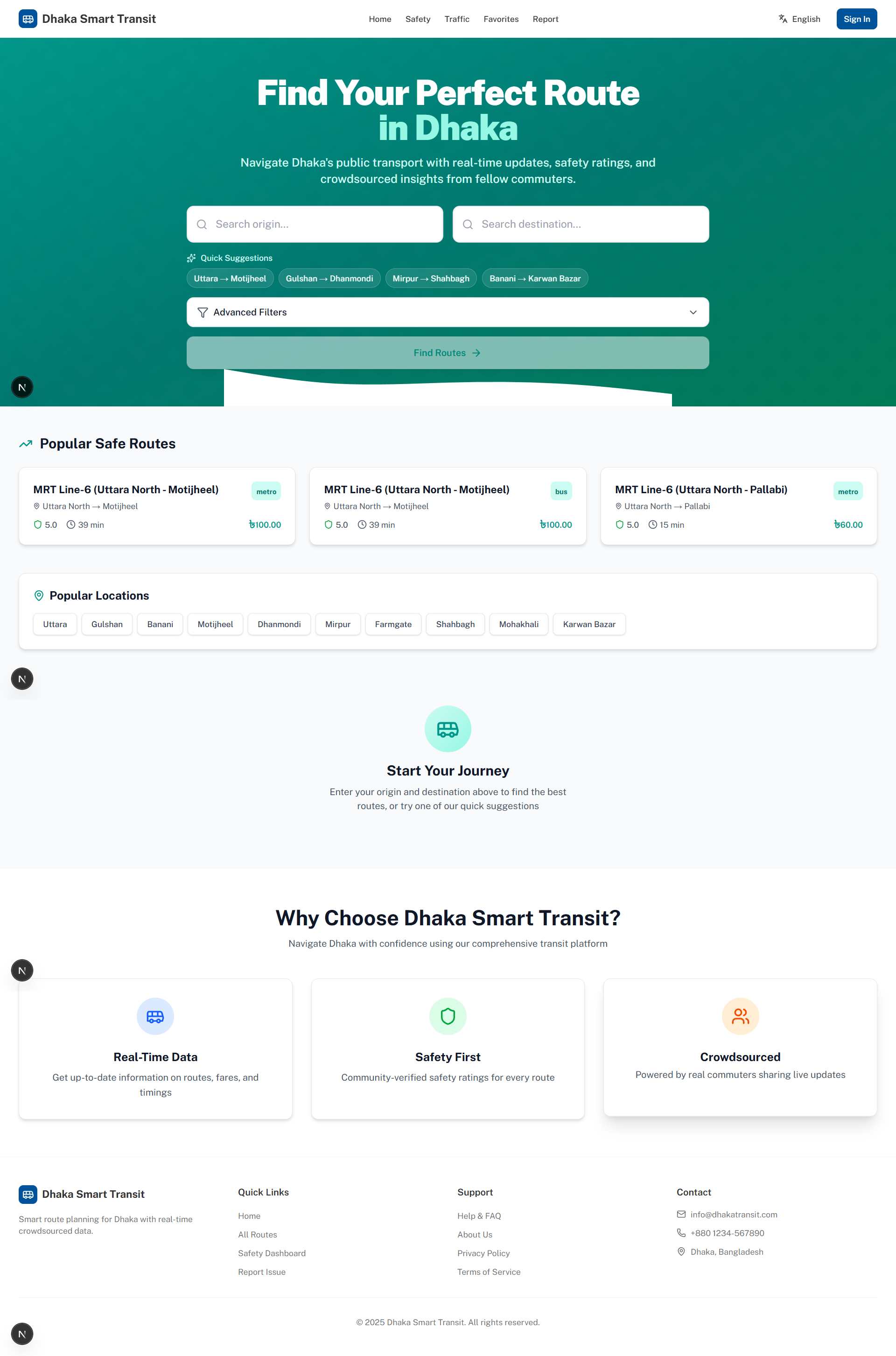 The platform crowdsources and shares real-time information on public transit—bus and rickshaw routes, fares, delays, safety incidents, and congestion. Users can access, save, and share optimal routes, report updates, view safety analytics, and see live traffic—all in one place. Stakeholders (authorities, NGOs, operators) can leverage this open data to improve planning, policy, and service quality.