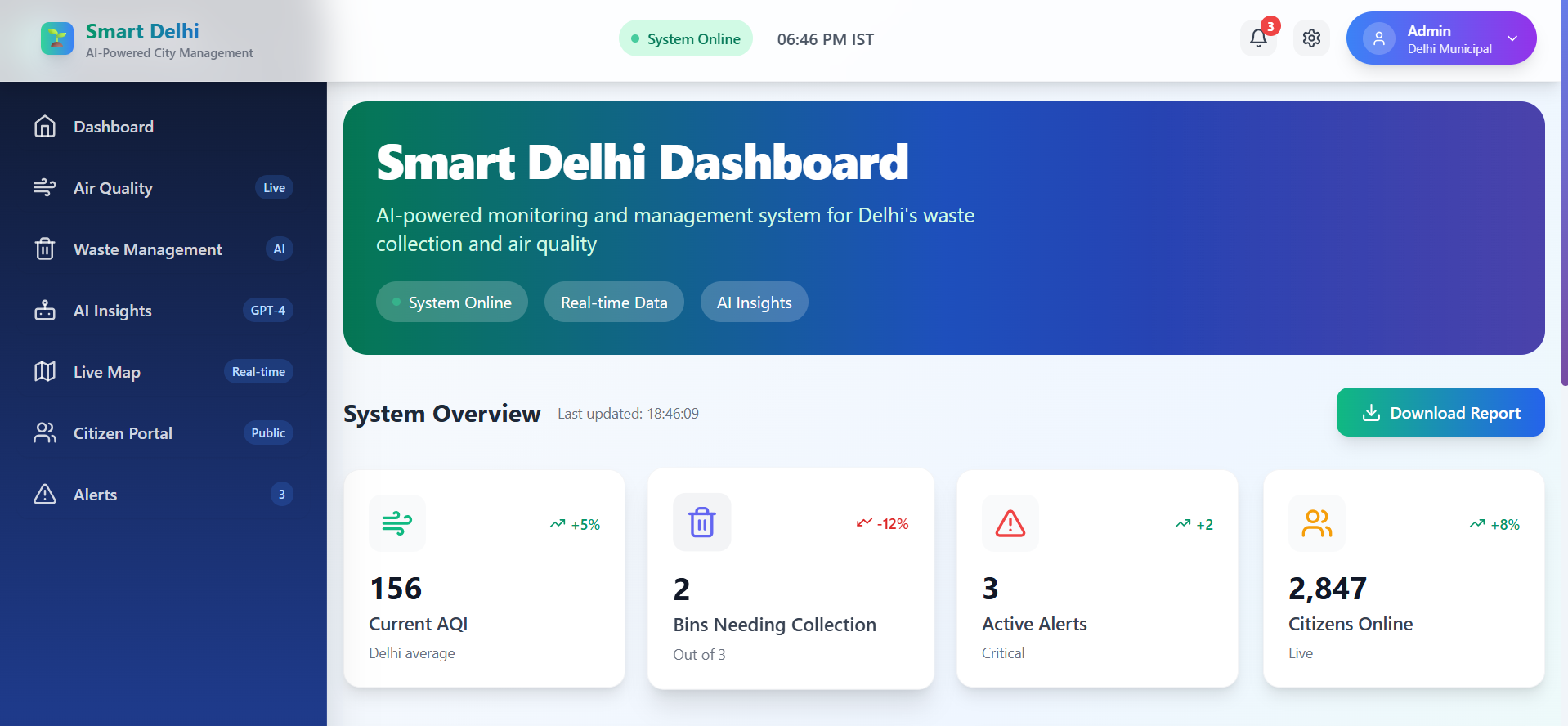 Smart Delhi is a revolutionary AI-powered smart city management system that transforms Delhi into a sustainable, efficient, and citizen-friendly metropolis.