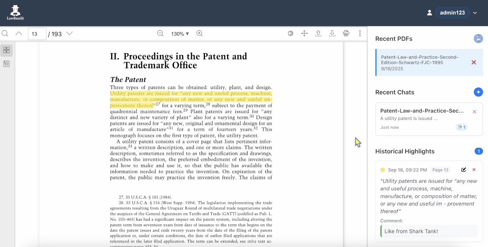 The PDF reader was built using react-pdf-viewer as the foundation, chosen for its robust rendering capabilities and extensive plugin ecosystem. The highlighting system integrates seamlessly with the official highlight plugin, providing reliable text selection across multiple lines and accurate positioning that persists across sessions.