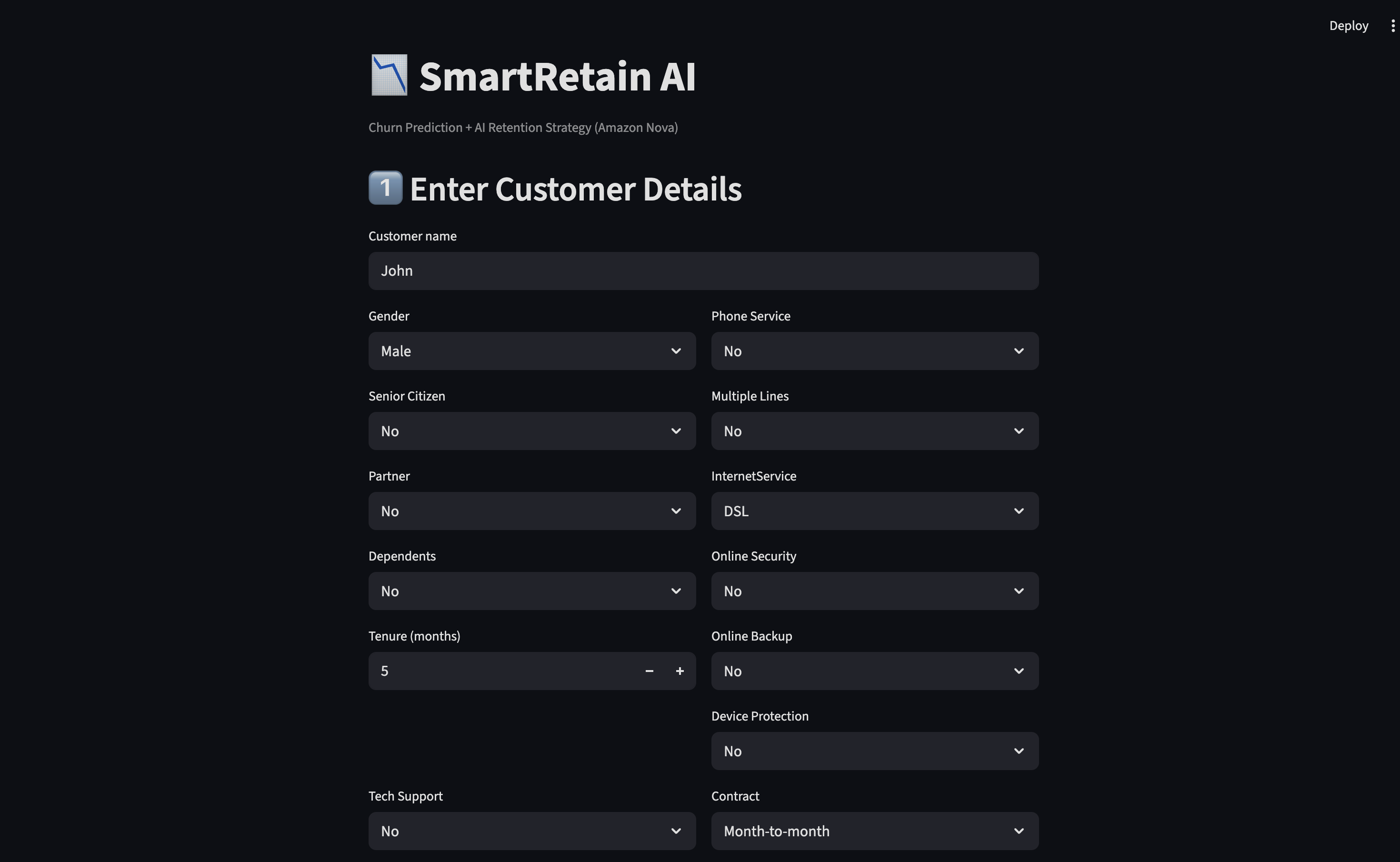 What it does: SmartRetain-AI is an AI-powered platform that helps businesses identify customers who might churn and provides recommendations on how to retain them. The system: • Predicts churn probability using machine learning • Categorizes customers into Low, Medium, or High risk • Generates personalized retention strategies using Amazon Nova (LLM) • Provides actionable insights businesses can use • Allows downloading results for further analysis Instead of just showing predictions, the platform focuses on actionable intelligence.