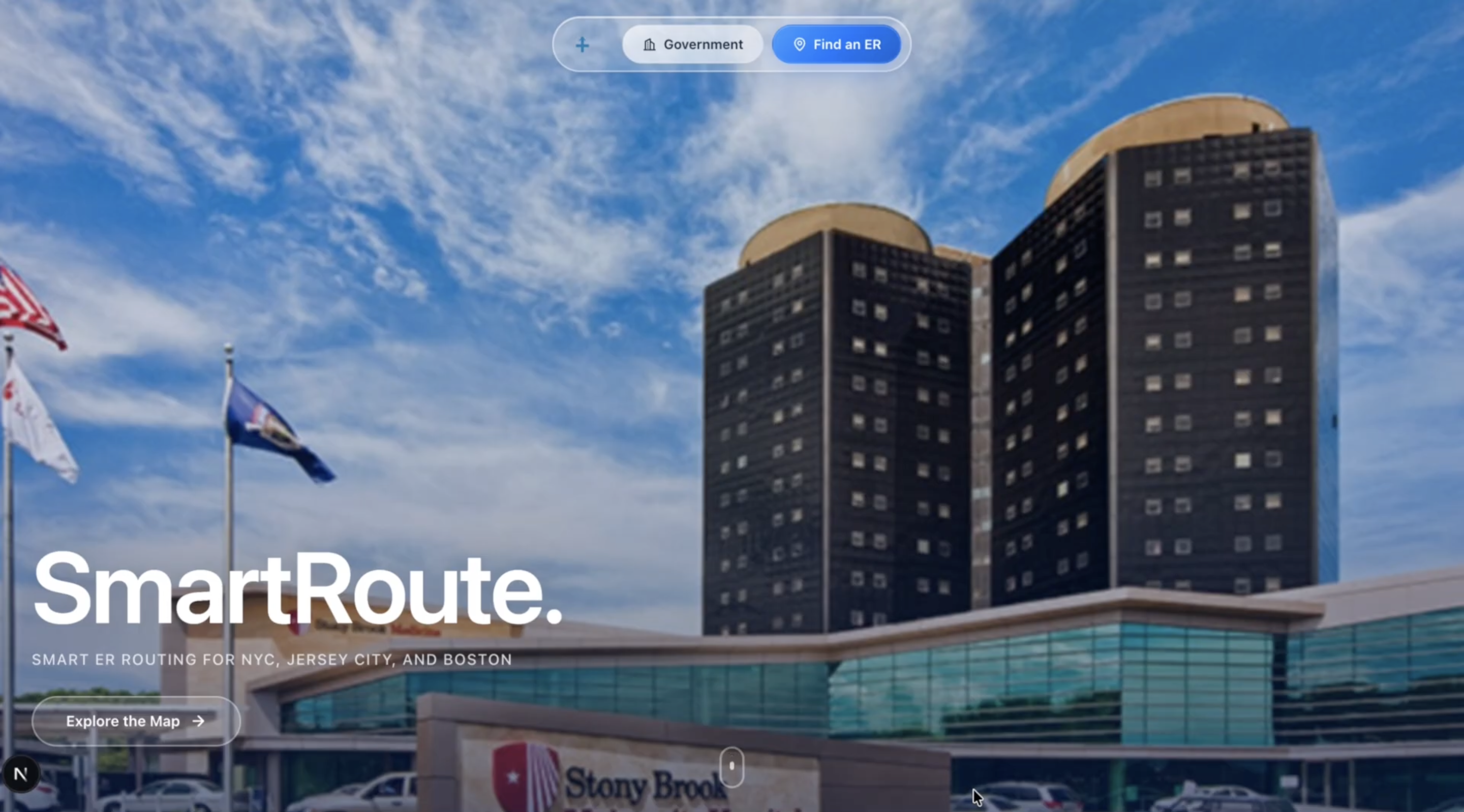 SmartRoute grew from that gap: help people reach the right ER faster using live routing and triage-aware scoring and give public-sector users a credible ER planning sandbox place, a blueprint site, simulate how demand redistributes, and export evidence for memos. We focused on New York City, Jersey City, and Boston as dense, data-rich metros where these tradeoffs show up every day.