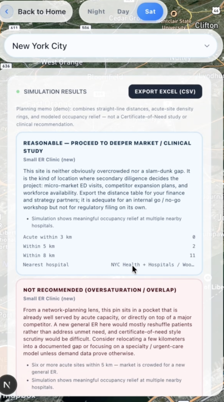 Government mode sends proposed ER sites (blueprints on parcels) to a simulation endpoint. Server-side code loads hospitals and latest occupancy, runs a distance-decay model over existing facilities (nearby sites feel the largest diversion of notional patient flow), and returns before/after metrics plus per-site reports. We pair that with Turf.js for geospatial helpers and export paths that produce CSV-friendly output for planning workflows. Heatmaps and flow visuals on the map communicate how catchment shifts when a new ER is dropped on the canvas.