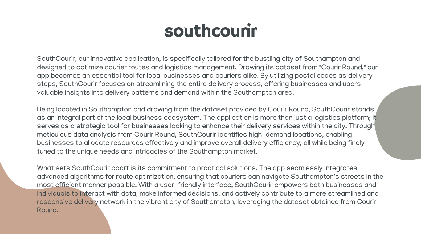 At its core, our project is committed to bridging the gap between technology and effective logistics. The integration of cutting-edge algorithms for route optimization ensures that couriers navigate Southampton's streets with precision and promptness. The user-friendly interface is designed to facilitate seamless interaction with data, encouraging active participation from both businesses and individual users. Join us in revolutionizing Southampton's delivery landscape, as we work towards creating a more streamlined, data-driven, and user-centric logistics framework for the city.