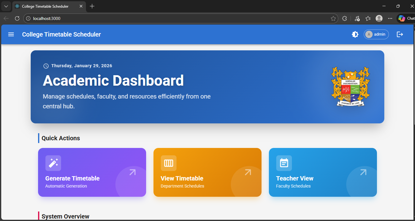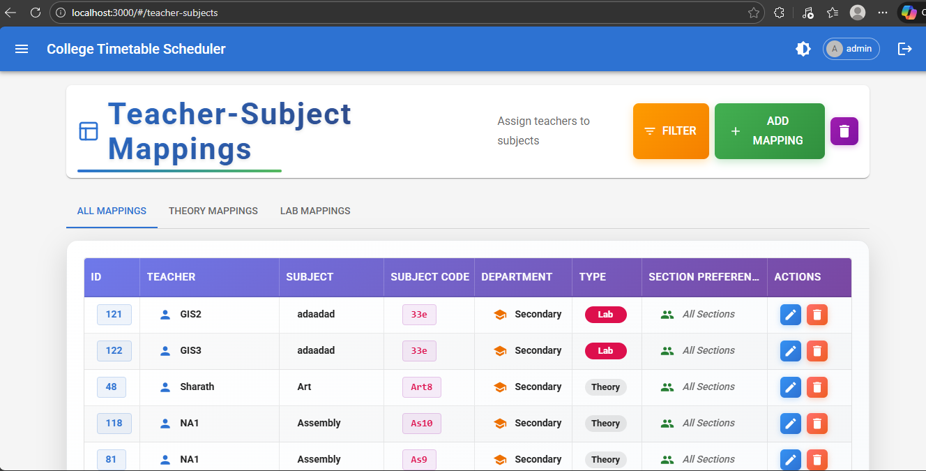 - Automated Schedule Generation: Uses AI algorithms (backtracking + constraint satisfaction) to generate optimal timetables