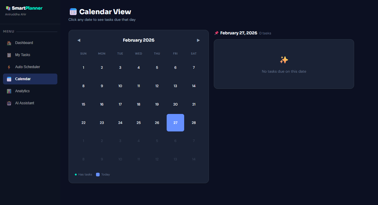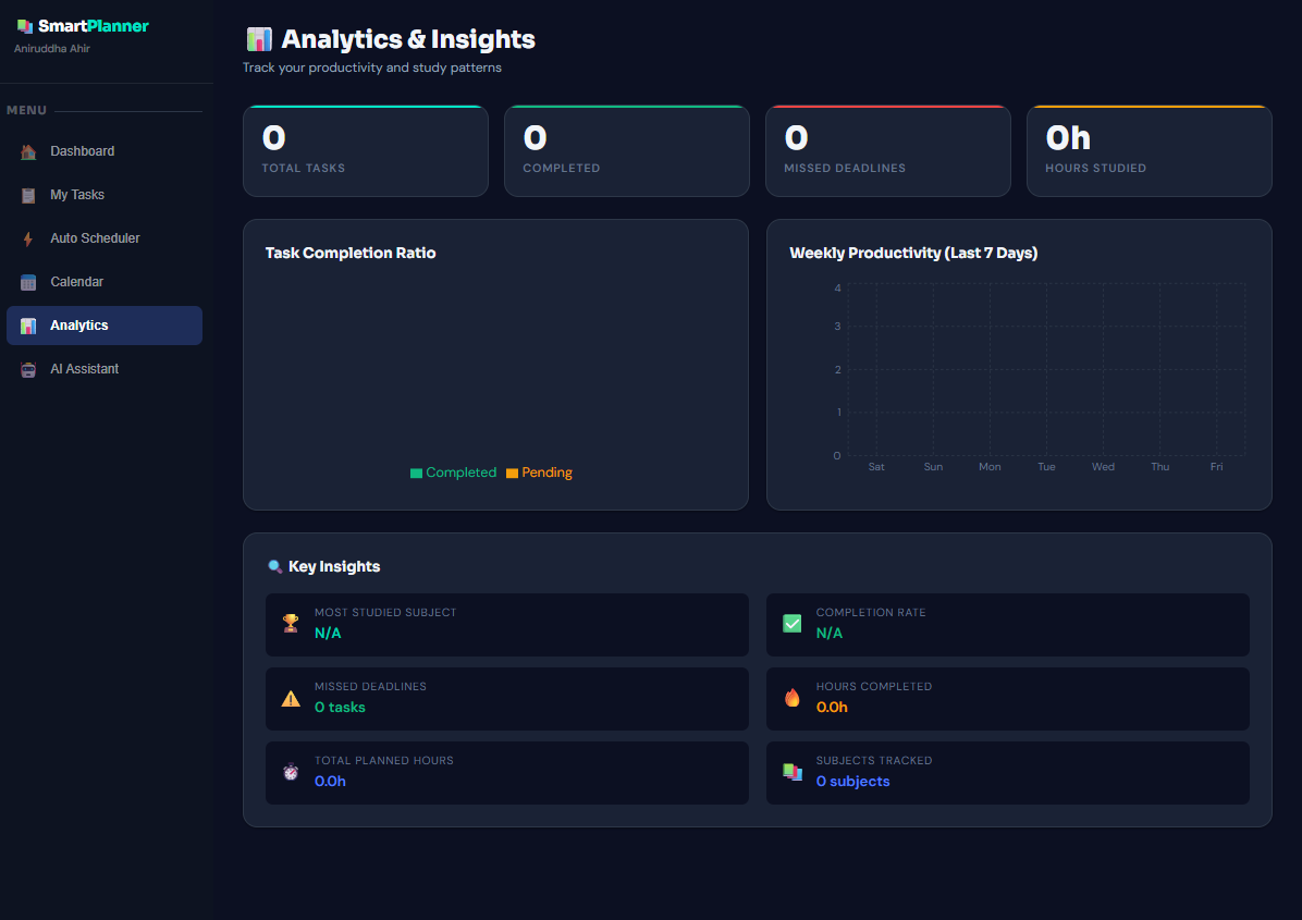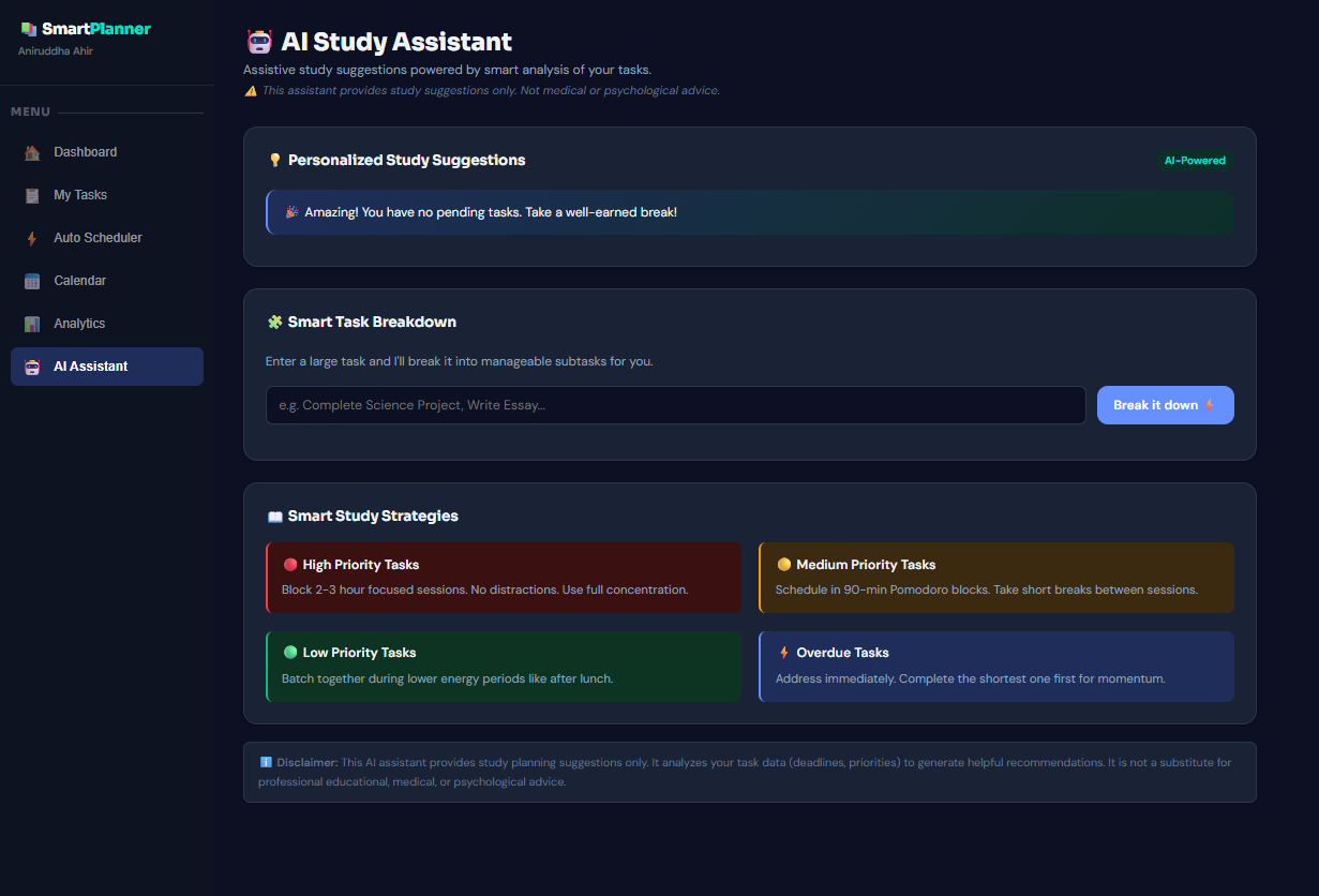 • Create and manage assignments with subject, deadline, priority, and estimated study time • Automatically prioritize tasks based on urgency and importance • Generate a personalized daily study schedule • Adapt task priority when deadlines approach • Track productivity streaks and progress • View deadlines in a calendar format • Analyze performance through productivity charts • Receive AI-assisted study suggestions • Break large tasks into smaller, manageable subtasks