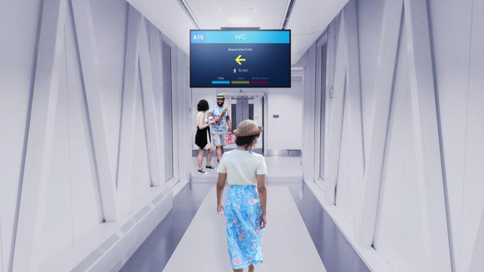 Indicate the most urgent needs for passengers fresh out of the plane: 1) Toilet, 2) Water, 3) Device charge. The screen gives info on time from current location to desired spot (hereby referred to as time away) and queue length/time (time wait). Considering live update of people flow and crowding effect, different options will be suggested to different batches of passengers coming out of the plane.