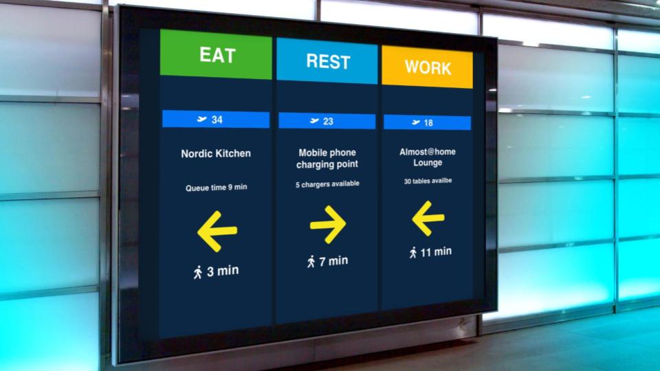 So instead of an app at your phone, your fingertips, what else can we do? Signage! Finavia's problem of signage and people flow management, and a new idea started brewing in our minds. What if we create big attractive screens that are 'in your face' (so that you'll never miss them) with the smartest display of information based on passengers' most urgent and important needs, colour-coded, during their airport experience?