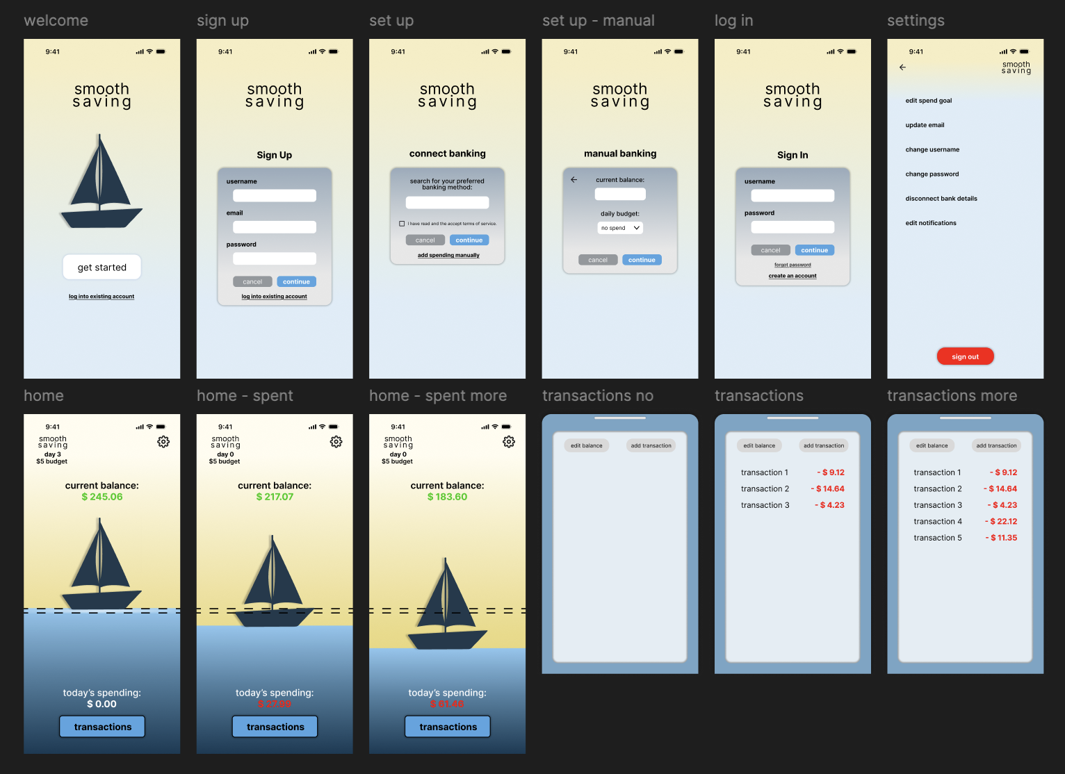 In Smooth Saving, you create an account, input a current balance, and your goal is to try not to spend it day to day. If you spend money, the water your boat is smoothly sailing on will start to lower. There is a transaction log that will update when you spend money. There is also an option for budgeting. Instead of committing to "no spend" days, you can give yourself a budget of $5, $10, $20, and $50 a day. If you spend within your allotted budget, your boat will stay afloat and continue to sail smoothly.