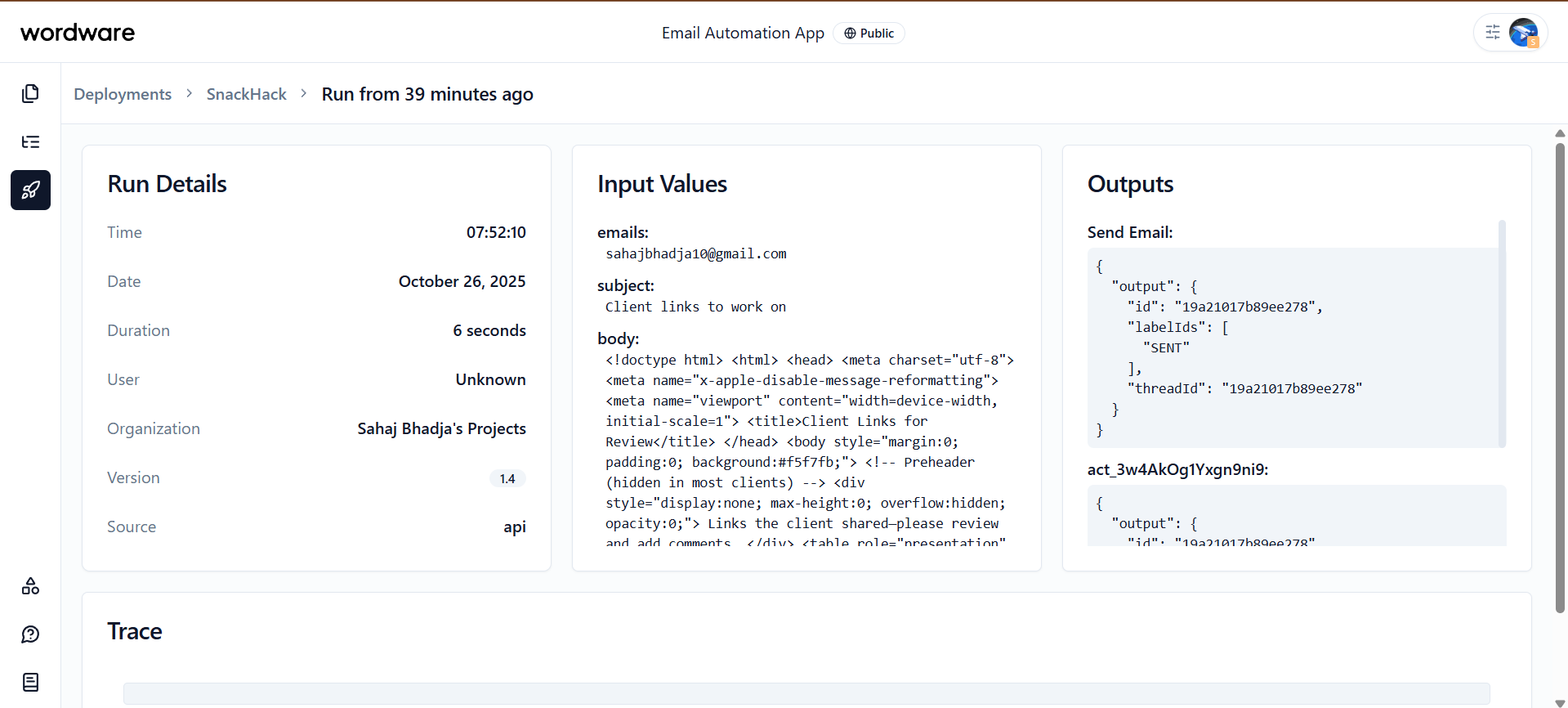We used Wordware for automation and telemetry visualization, Python + Flask for backend logging, and a mock SMTP setup to ensure all emails were contained within a sandboxed environment.
