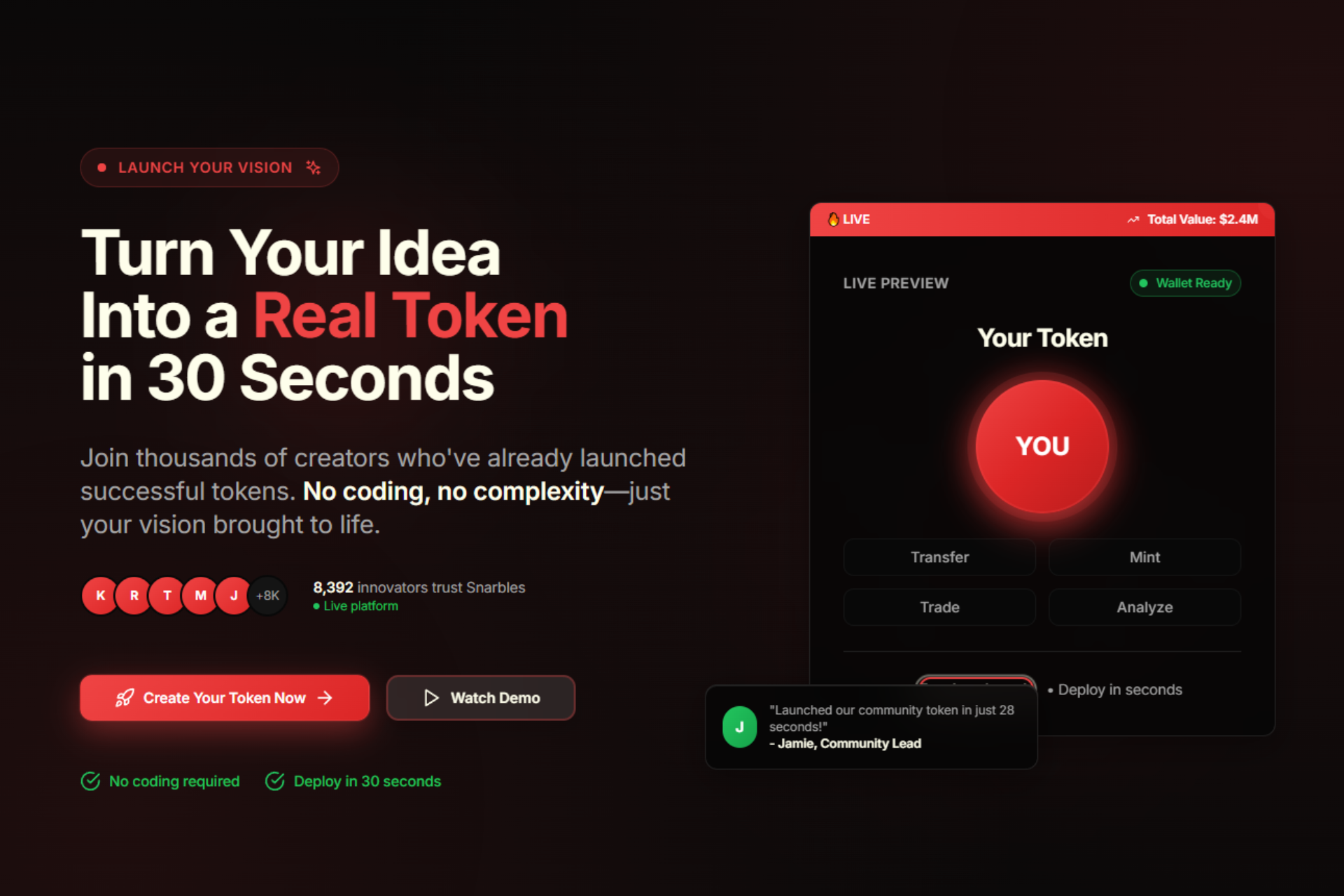 Snarbles is a multi-chain no-code token creation platform that transforms blockchain token deployment from weeks to 3 minutes. Users can:
