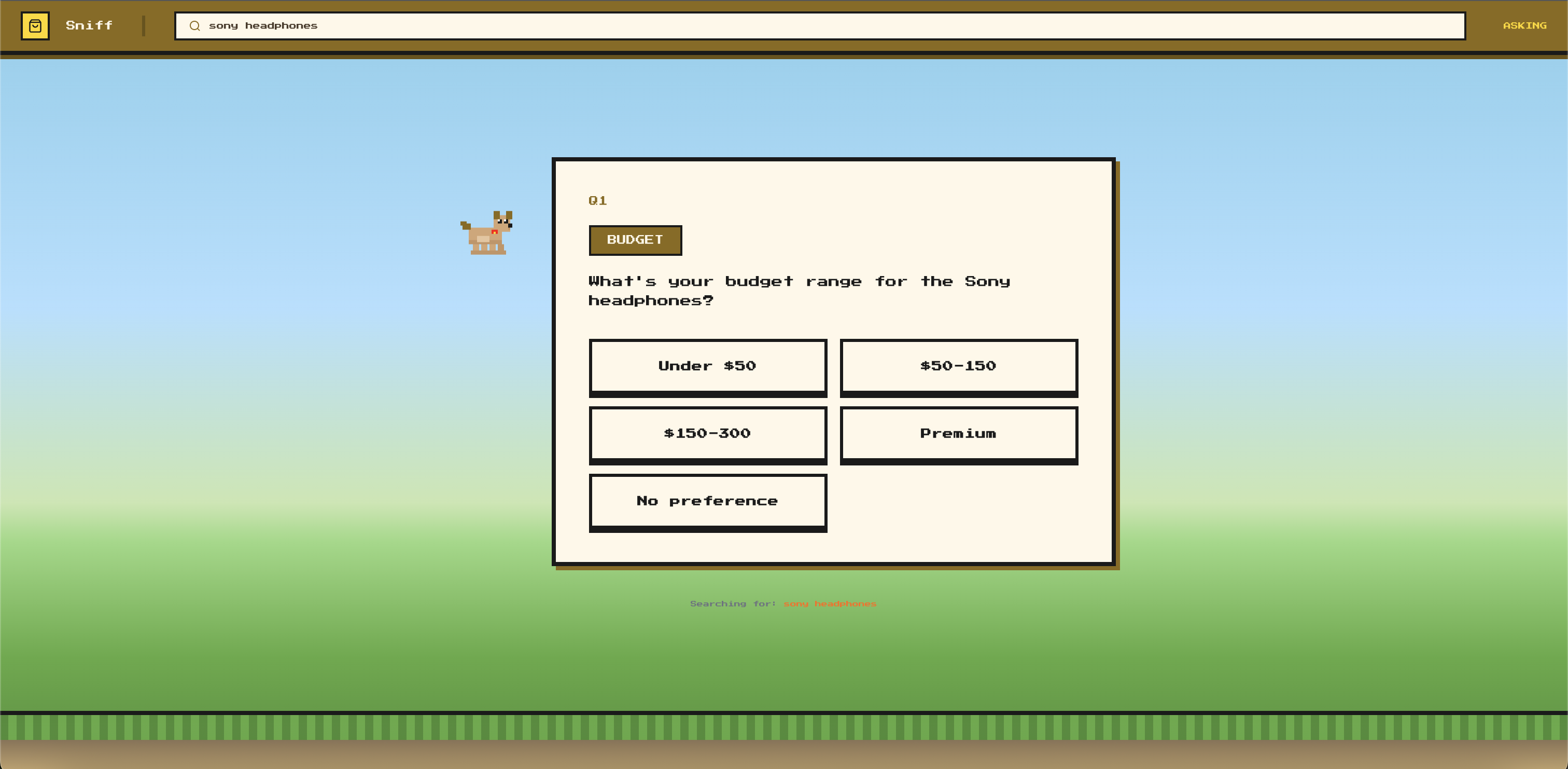 - Guided Discovery: Sniff starts a conversation, not a search. It asks the right clarifying questions (gender, style, budget, brand) to understand exactly what you need before searching.