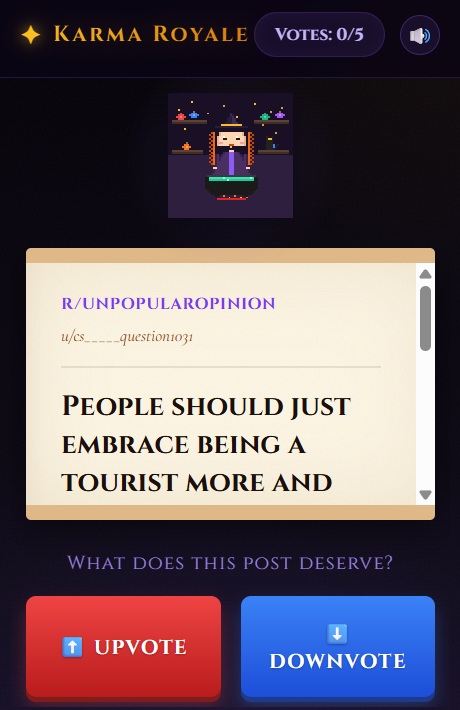 Reddit is defined by the "Vibe Check." Every day, millions of us upvote and downvote without a second thought. We were inspired to turn this invisible utility into a mystical daily ritual. We asked: “What if your voting habits weren’t just metrics, but ingredients in a potion?” Inspired by classic 16-bit indie RPGs and the high-stakes human drama of subreddits like r/AmItheAsshole, we built a game where a pixel-art witch judges your soul to reveal your true Reddit alignment.