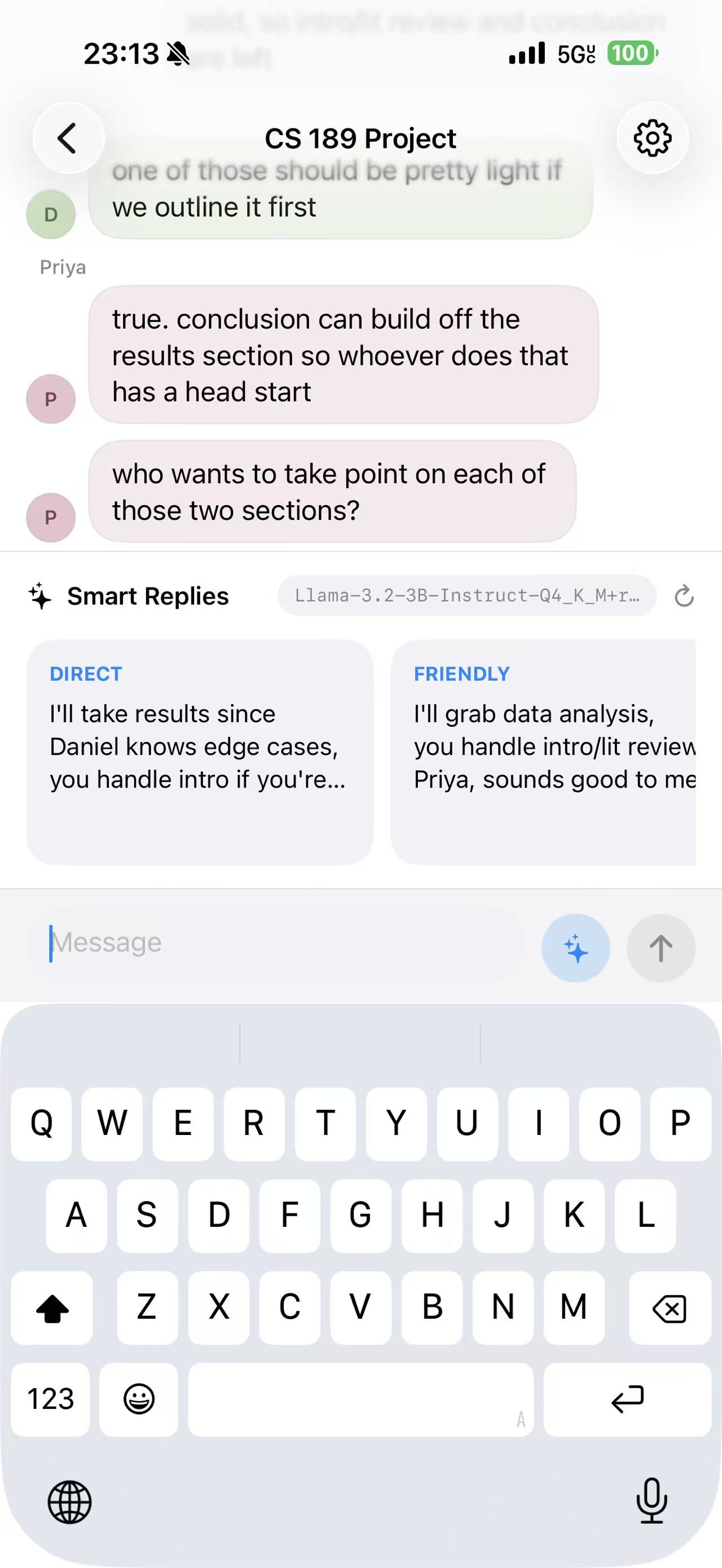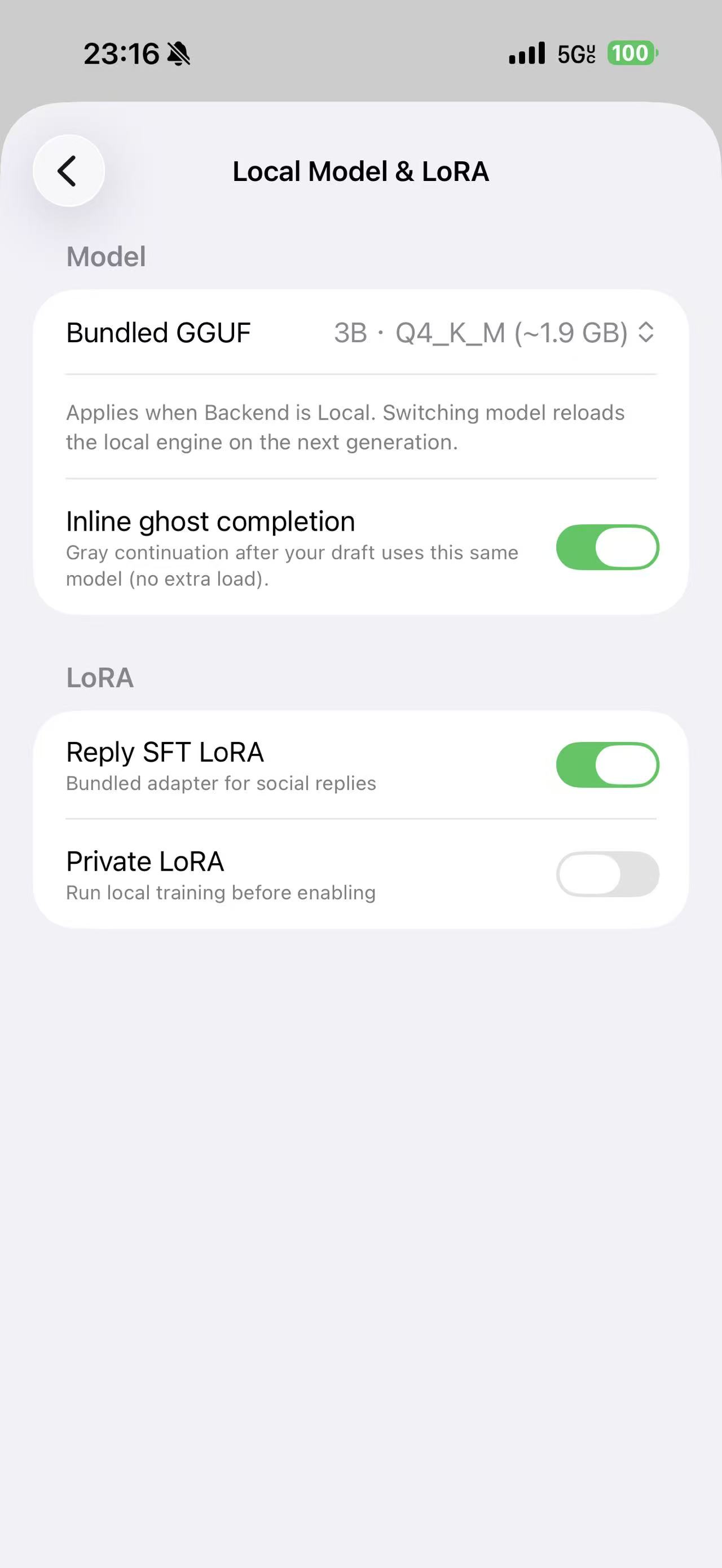 We tested multiple small models, including Qwen, Llama 3.2, Gemma, and TinyLlama-style models, to compare reply quality, latency, and mobile feasibility. Based on our experiments, Llama 3.2 3B gave us the best balance between social understanding and local deployment. We also built a distillation pipeline and generated around 2,000 social-reply samples using Claude. The data was designed to avoid common AI-writing problems: being too formal, too long, too polished, or too emotionally over-explained. On the model side, we explored supervised fine-tuning and LoRA adaptation. The model is trained around a simple structure: short conversation context + user intention + tone -> natural reply. For deployment, we built an iOS prototype with a Swift frontend and local LLM inference using quantized models. This keeps private conversation data on device instead of sending it to a cloud API. The most experimental part is on-device LoRA training. Instead of retraining the full model, we freeze the base model and train a small adapter from user-approved examples. In the future, when a user edits or selects a reply, that can serve as local training data for their personal model.