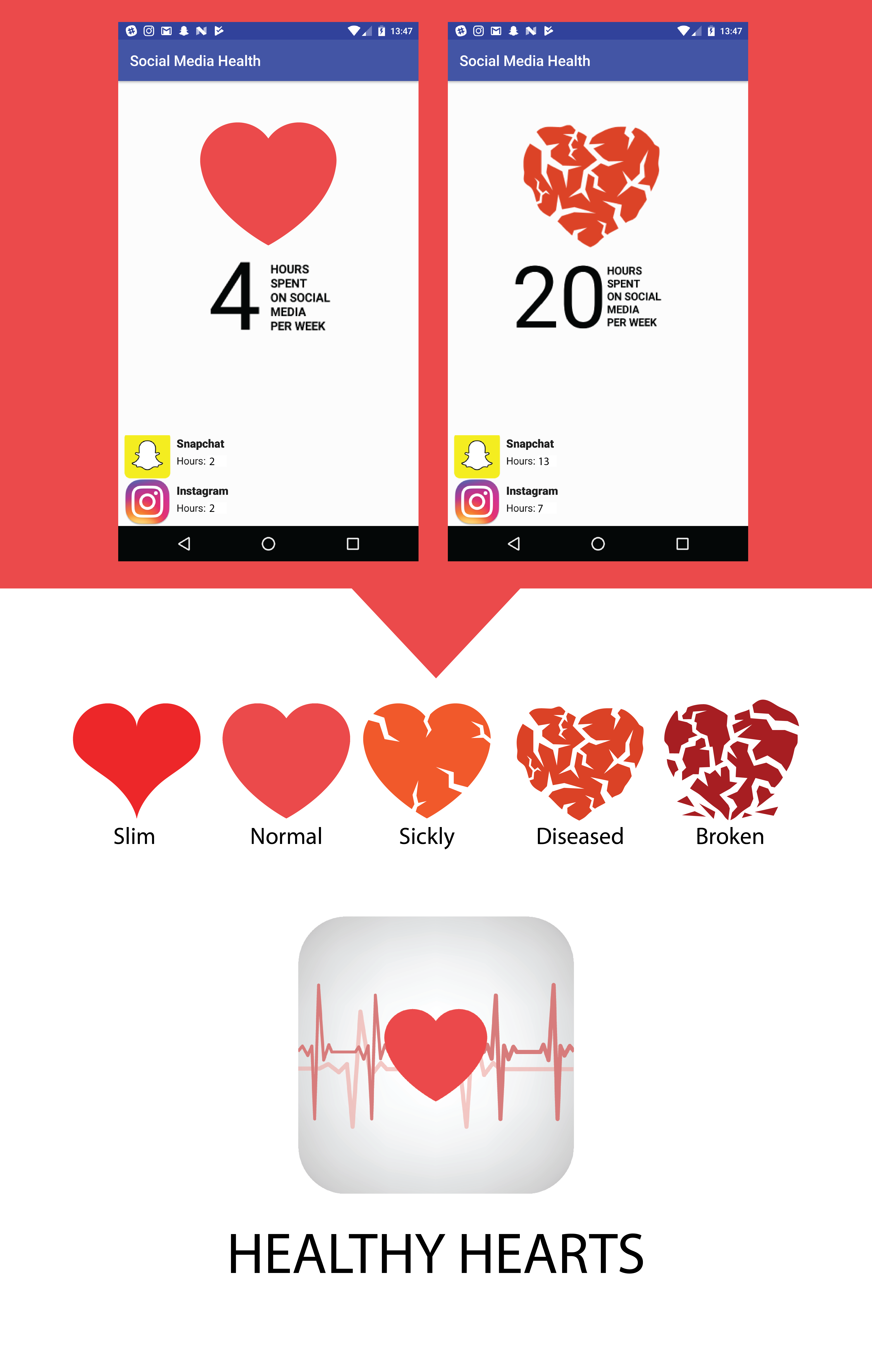 2 The app measures how long users spend on social media apps and displays a heart, which can range from slim and pretty in appearance to ugly and cracked, indicating if a user is spending unhealthy amounts of time on social media. In many cases, merely being made aware of an issue is enough to cause people to reconsider their behaviour.