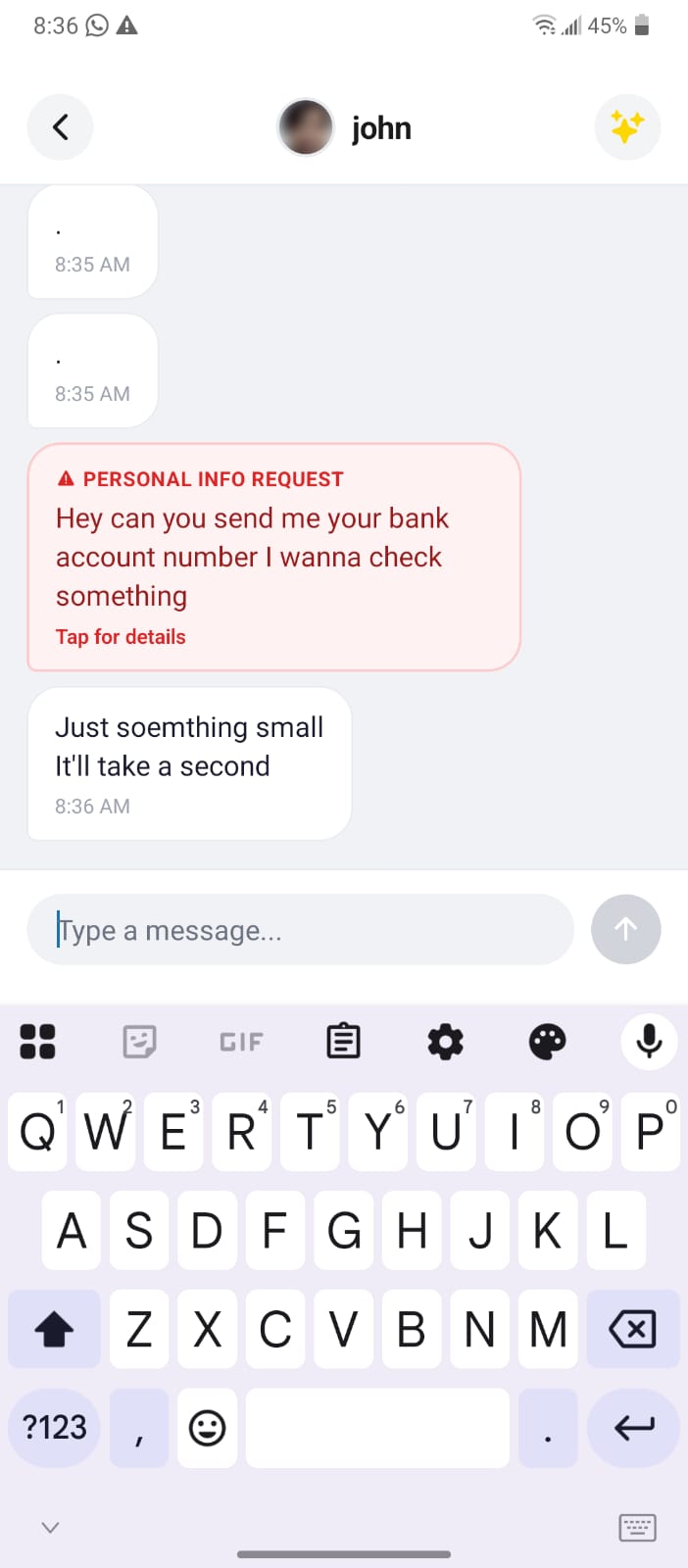 ### Layer 1 — Local Keyword Engine (instant, free, offline) Every incoming message is scanned on-device against a dictionary of red flag patterns across 7 categories: personal info requests, financial scams, drug references, inappropriate content, threats, suspicious links, and platform switching pressure. Flagged messages instantly turn red in the chat.