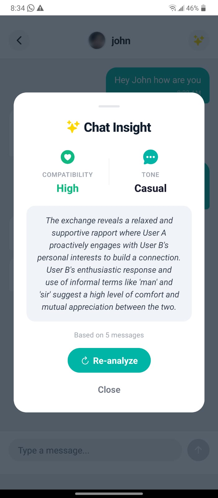 - Chat Compatibility — tone detection, compatibility scoring ($\text{High} \mid \text{Medium} \mid \text{Low}$), and behavioral pattern insights across the full conversation history