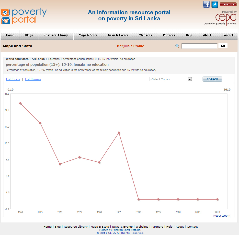 The Poverty Portal initiated by the Centre for Poverty Analysis (CEPA) in 2007, is an on-line platform for practitioners, researchers and students to obtain macro and micro level information on poverty in Sri Lanka using a variety of innovative and interactive features. The prime objective of the Portal is to facilitate wide scale dissemination of information, and encourage informed decision and policy making practices. The Portal's growing resource base holds over 850 published and grey resources, over 500 maps, and a range of applications that encourage dissemination of data and resources. It also provides opportunities for networking, greater sharing of information and discussion of issues. Further, providing information in local languages has increased access to a wider audience transcending language barriers. The portal currently has 15 partner organizations through the Poverty Portal Network. The ‘maps and stats’ section is a supplementary tool on the Poverty Portal that provides an enhanced presentation of poverty mapping in both Sri Lanka and the region using state generated and CEPA collected data. The site has a range of resources including maps, graphical presentations and data tabulations. The’ maps and stats’ component is a navigation tool providing spatial poverty characteristics that generate regional poverty profiles down to Divisional Secretariat levels. This section enables members to perform aerial and thematic searches to improve awareness on information gaps between national and regional poverty in Sri Lanka. Based on secondary data, maps have been generated on two provinces in Sri Lanka; Sabaragamuwa and Uva provinces and will also include data and graphical presentations from the Eastern province in 2011. In addition, it includes micro data on urban poverty and multidimensional poverty themes using CEPA's own work. Further, it also features a library of maps and statistics aimed at providing access to data and thereby greater understanding of poverty related issues for better informed decision making at the policy level.