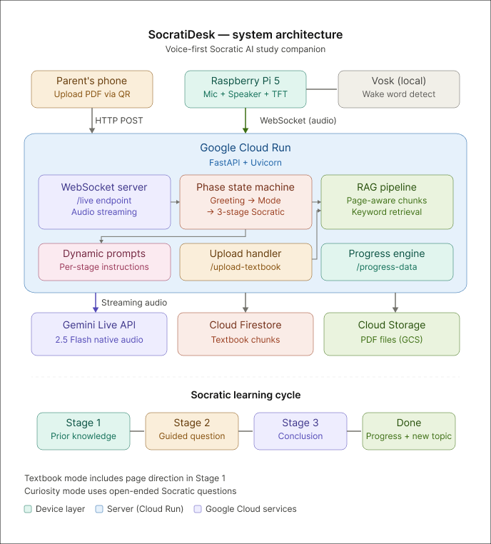 SocratiDesk is a voice-first AI study companion built on a Raspberry Pi 5.