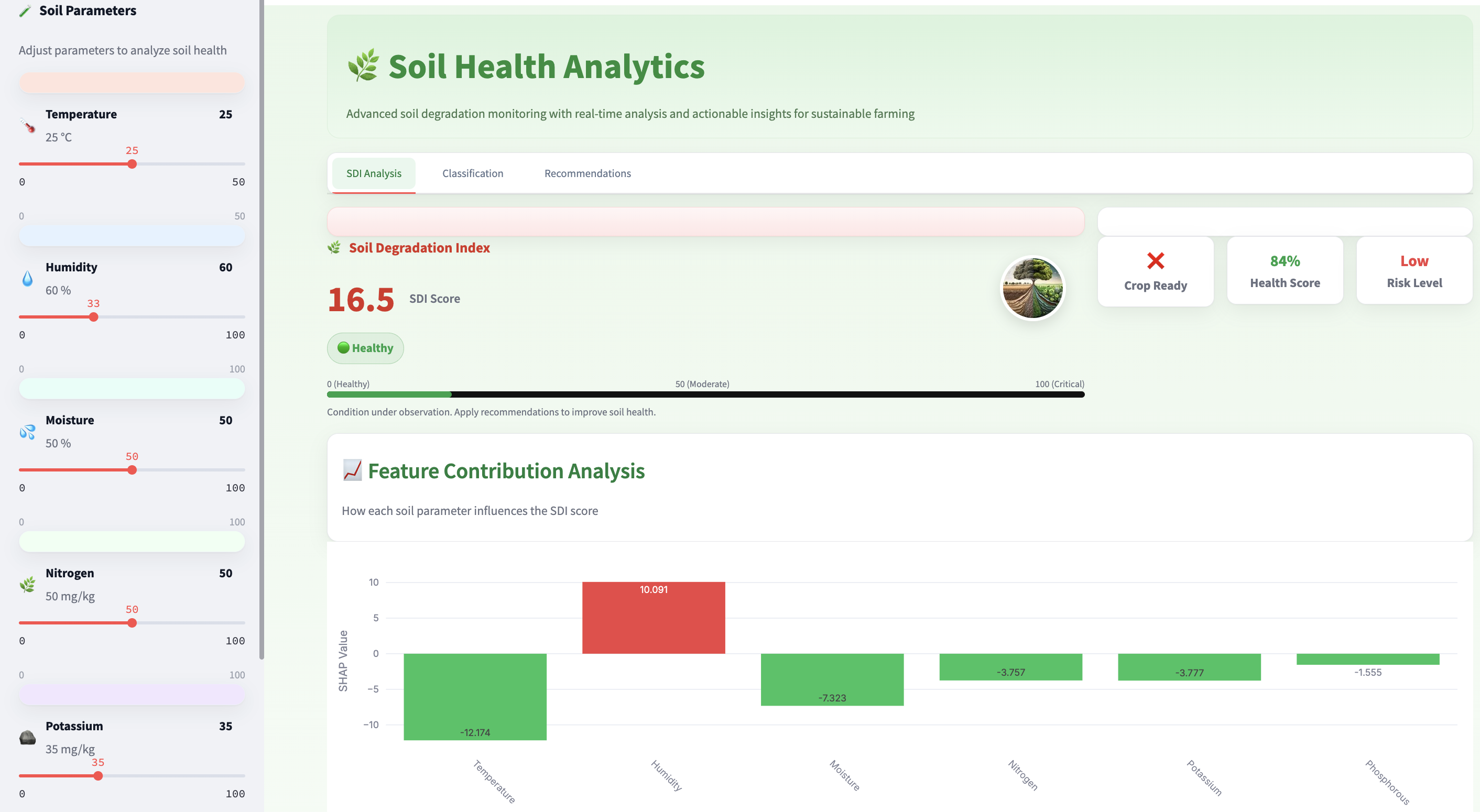 The platform also uses SHAP (Shapley Additive Explanations) for explainability, providing actionable insights to farmers on which soil parameters need adjustment. The user-friendly dashboard allows real-time updates as input parameters change, enabling farmers to instantly see the impact on soil health.