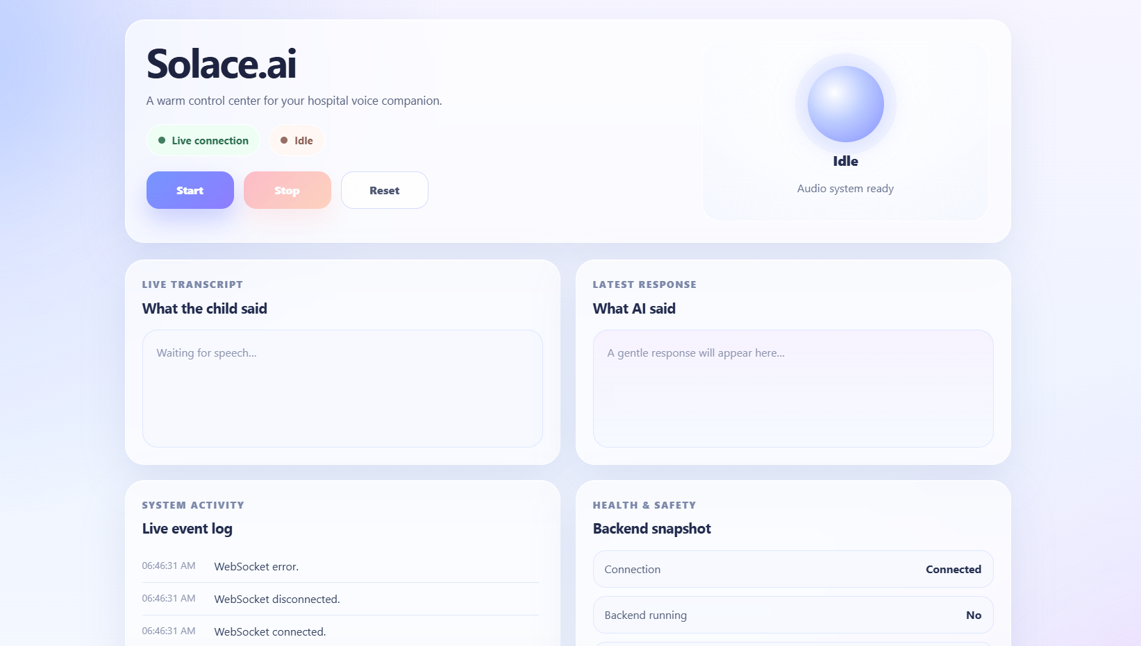 Children experiencing prolonged hospital stays often face extreme fear, isolation, and stress. While their physical health is closely monitored, their emotional well-being can be harder to consistently support. This led me to build Solace.ai: a real-time voice-based AI companion designed to provide safe, emotionally aware conversation for children in hospitals.
