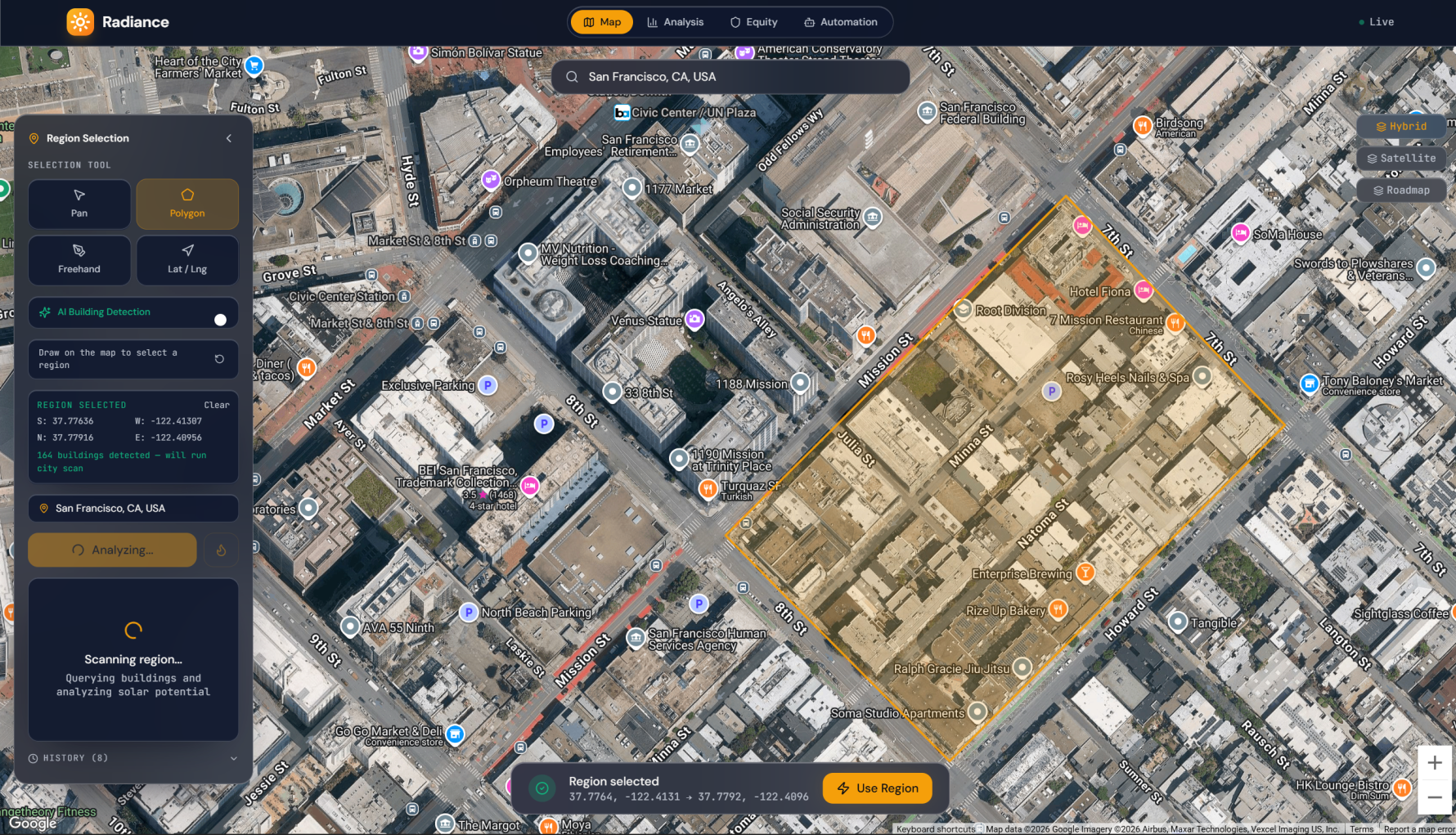 City-Scale Scanning & Heatmaps — Submit a bounding box and Radiance queries OpenStreetMap for every building, runs lightweight solar analysis on each, and renders a Deck.gl WebGL heatmap showing raw solar potential or unrealized capacity across the city.