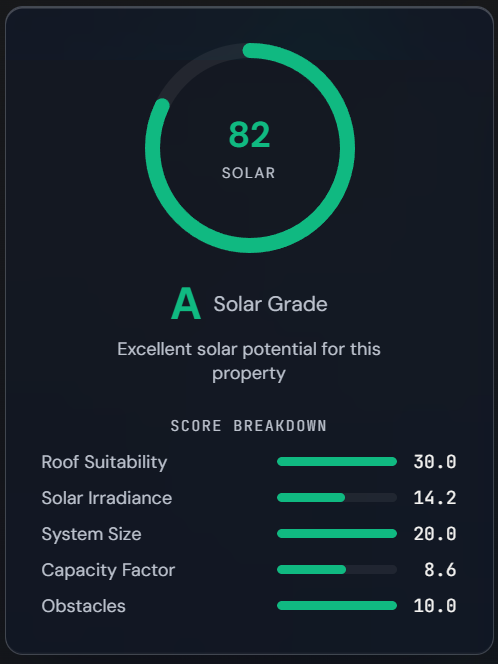 City-scale performance — Running even a lightweight solar analysis on hundreds of buildings in a bounding box required careful batching, synthetic fallbacks when OSM data is sparse, and single-fetch irradiance sharing across the scan.