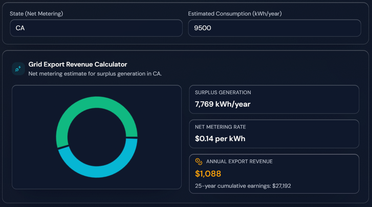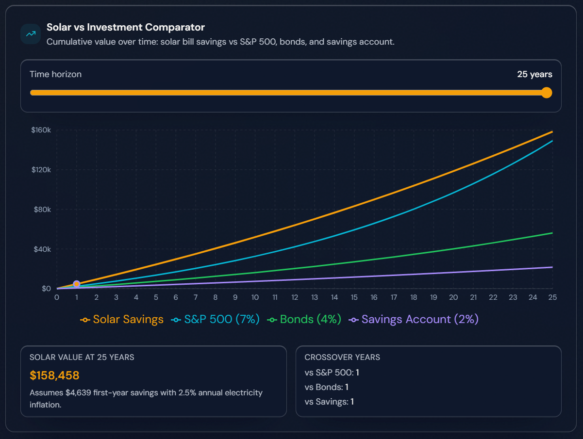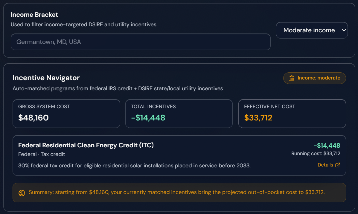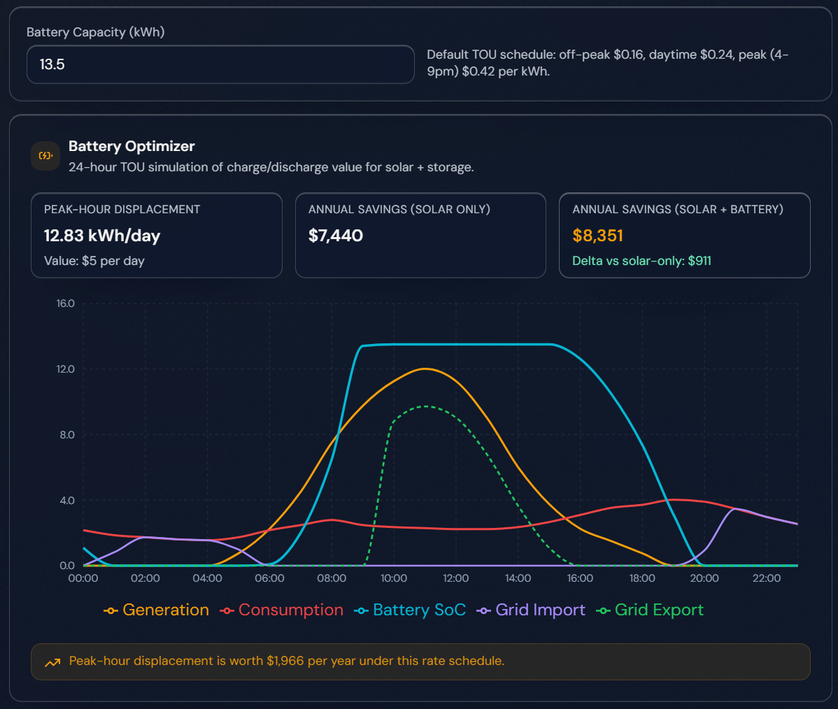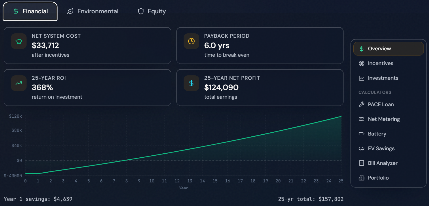 8 Financial Calculators — Battery optimizer, EV savings, net metering, PACE financing, investment comparator, bill spike analyzer, incentive navigator, and property portfolio dashboard.