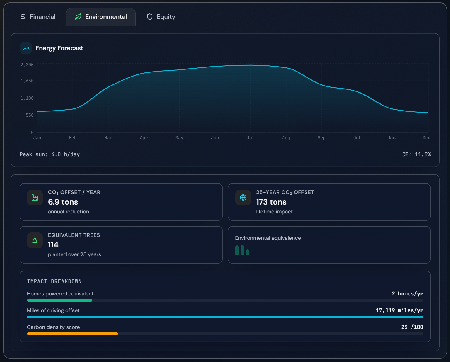 Every year, billions of dollars in federal solar incentives go unclaimed in the communities that need them most. We saw a disconnect: rooftop solar tools exist for individual homeowners, but city planners and policymakers have no way to see which neighborhoods should be prioritized, why they're underserved, or what to do about it. We wanted to build something that doesn't just tell you "your roof gets 5.2 peak sun hours" — it tells a city council "Block Group 3204 has a median income of $28K, 62% renters, zero solar installations, and the highest energy burden in the county — here are the grants they qualify for and a deployment roadmap that respects your grid constraints." We also wanted to challenge ourselves technically: could we build a polyglot microservice architecture at a hackathon, with a financial engine written in Smalltalk running alongside a Python AI pipeline?