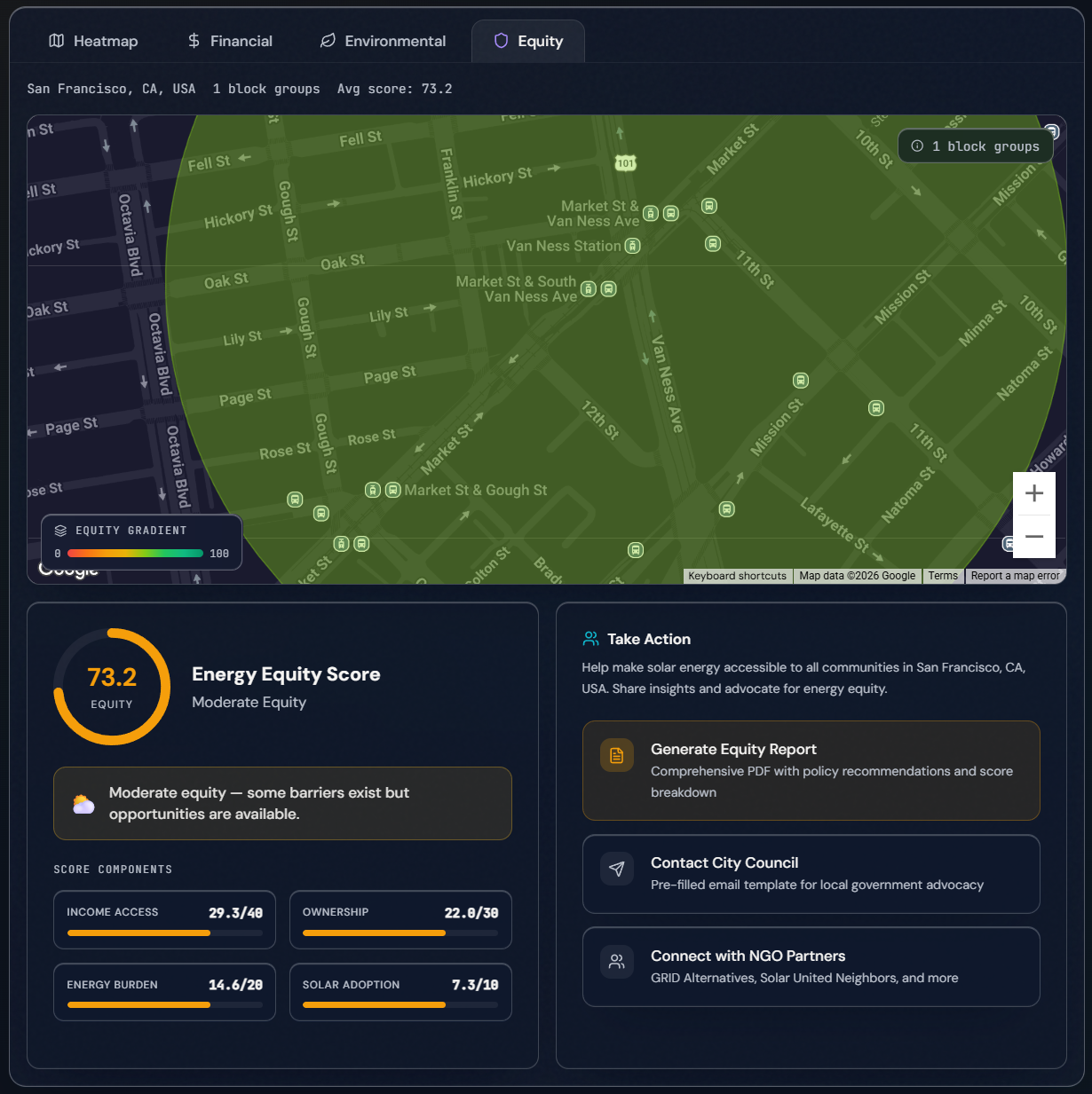 WattsUp Equity Score — A 0–100 composite index per Census block group, built from live Census Bureau data: median income, renter percentage, energy burden, and existing solar adoption. The score surfaces why a neighborhood is underserved with human-readable barrier descriptions.