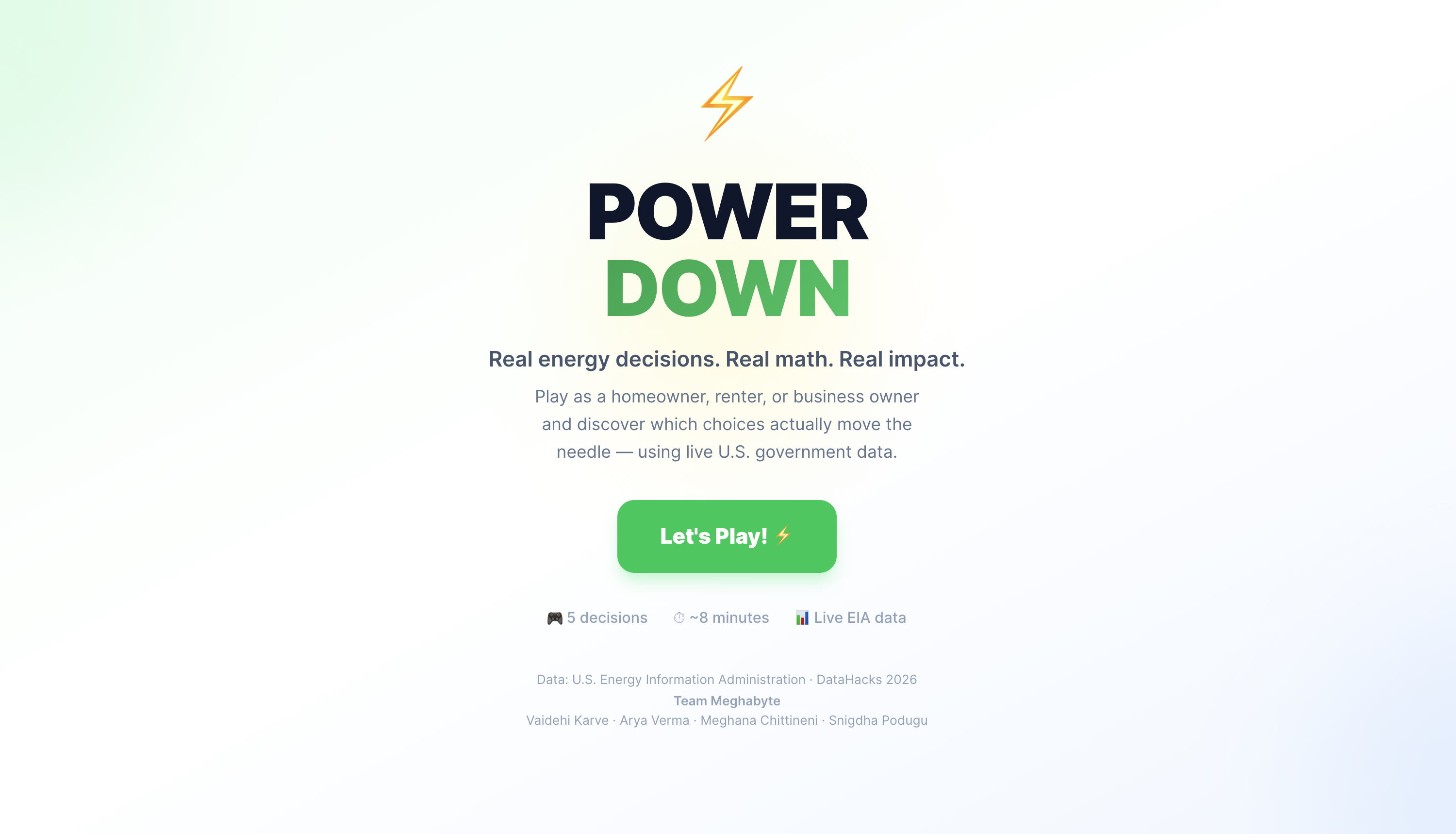 Power Down is an interactive simulation where users make decisions and instantly see the financial and environmental consequences. Users choose a persona (homeowner, renter, or small business owner), enter their ZIP code, and receive location-specific energy data. They then make decisions like adopting solar energy or adjusting consumption habits. Every financial and environmental outcome is calculated from real US government data. As users decide, an animated building updates in real time; solar panels appear on the roof, EVs pull into the driveway, and neighbouring houses light up with community solar. After the solar decision, a Permit Approval Time card powered by the ZenPower dataset shows the real average days between permit filing and approval in the user's chosen state, making bureaucratic friction visible. We also implemented a breakdown system that explains how each outcome was calculated using data and formulas. The app aims to tackle one of the most important questions when it comes to personal sustainability- how much does your impact really matter?