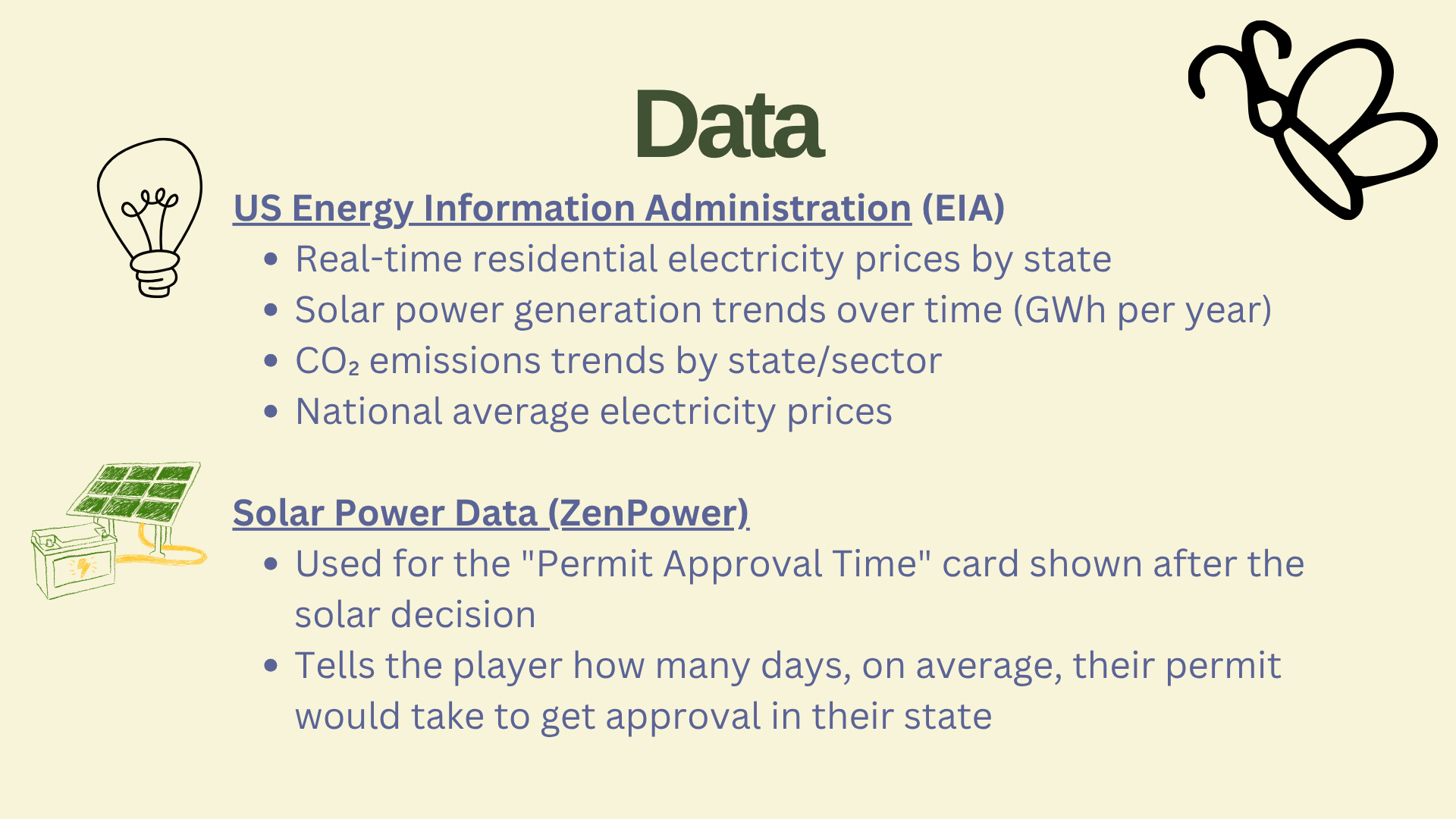 One of the biggest challenges was making data usable in an interactive simulation. Government datasets are not designed for real-time user interaction, so we had to structure and simplify them without losing accuracy, which meant carefully connecting EIA prices, ZenPower permit records, and CO2 factors into coherent calculations. Another challenge was designing a system where decisions feel both realistic and immediate. Modeling long-term impacts like cost savings, emissions reduction, and payback periods required balancing realism with user experience. We also faced difficulty designing the visualization system so that every decision changes the environment without overwhelming the user. Anticipating load inconsistencies with EIA API, we built a full fallback system that continues the game with clearly labelled national average estimates if any call fails. The ZenPower integration required transparent handling of incomplete state coverage so users always see a badge indicating whether they're seeing state-specific or national average data.