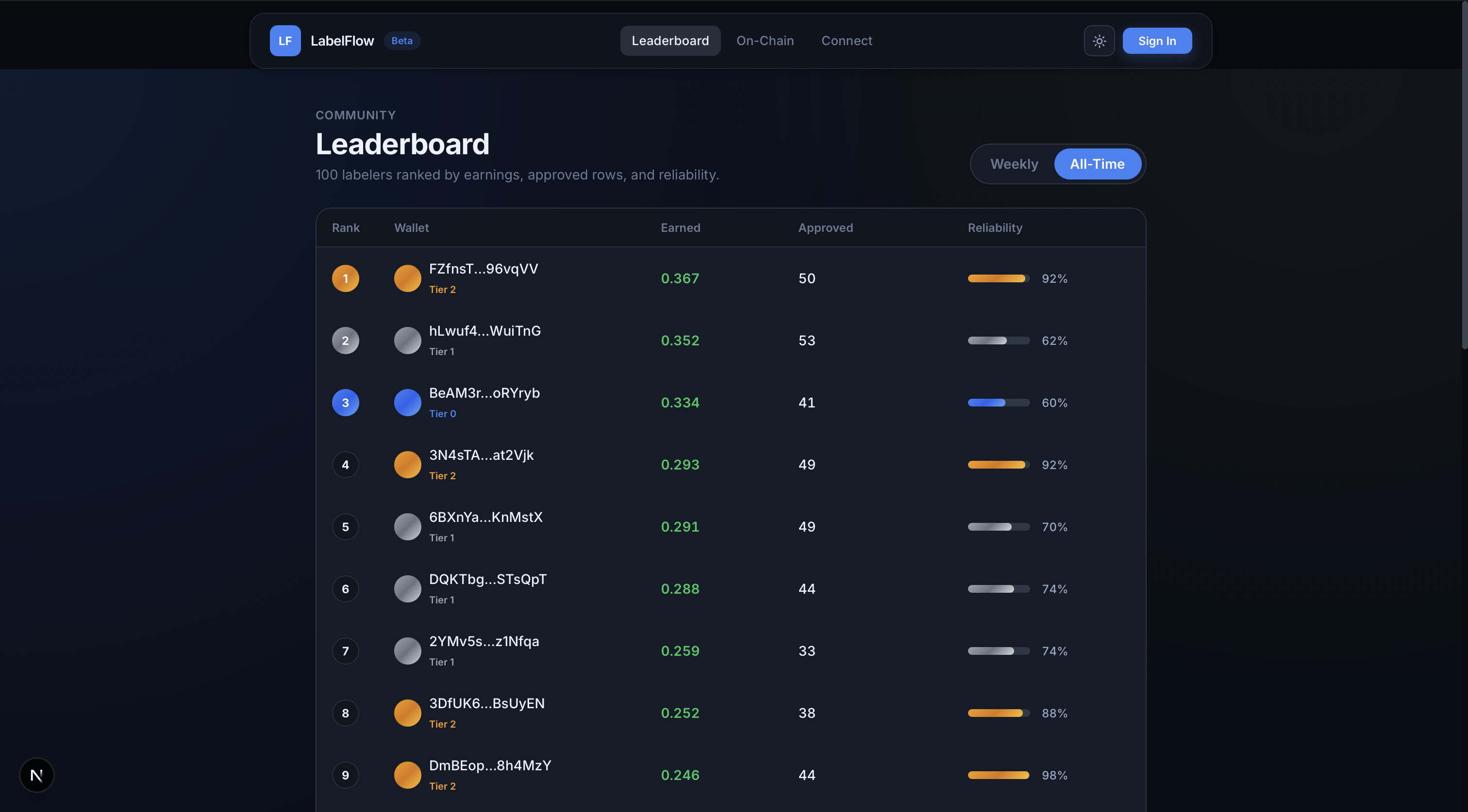 SOLabel uses AI to review human labeling tasks and verify their accuracy. Each submission is evaluated, and a dynamic trust score is assigned based on performance. Verified users are rewarded, while suspicious or bot-like behavior is penalized. Micropayments are issued through Solana, ensuring fast and low-cost transactions. The reward system scales with trust, meaning higher-quality contributors earn more over time.