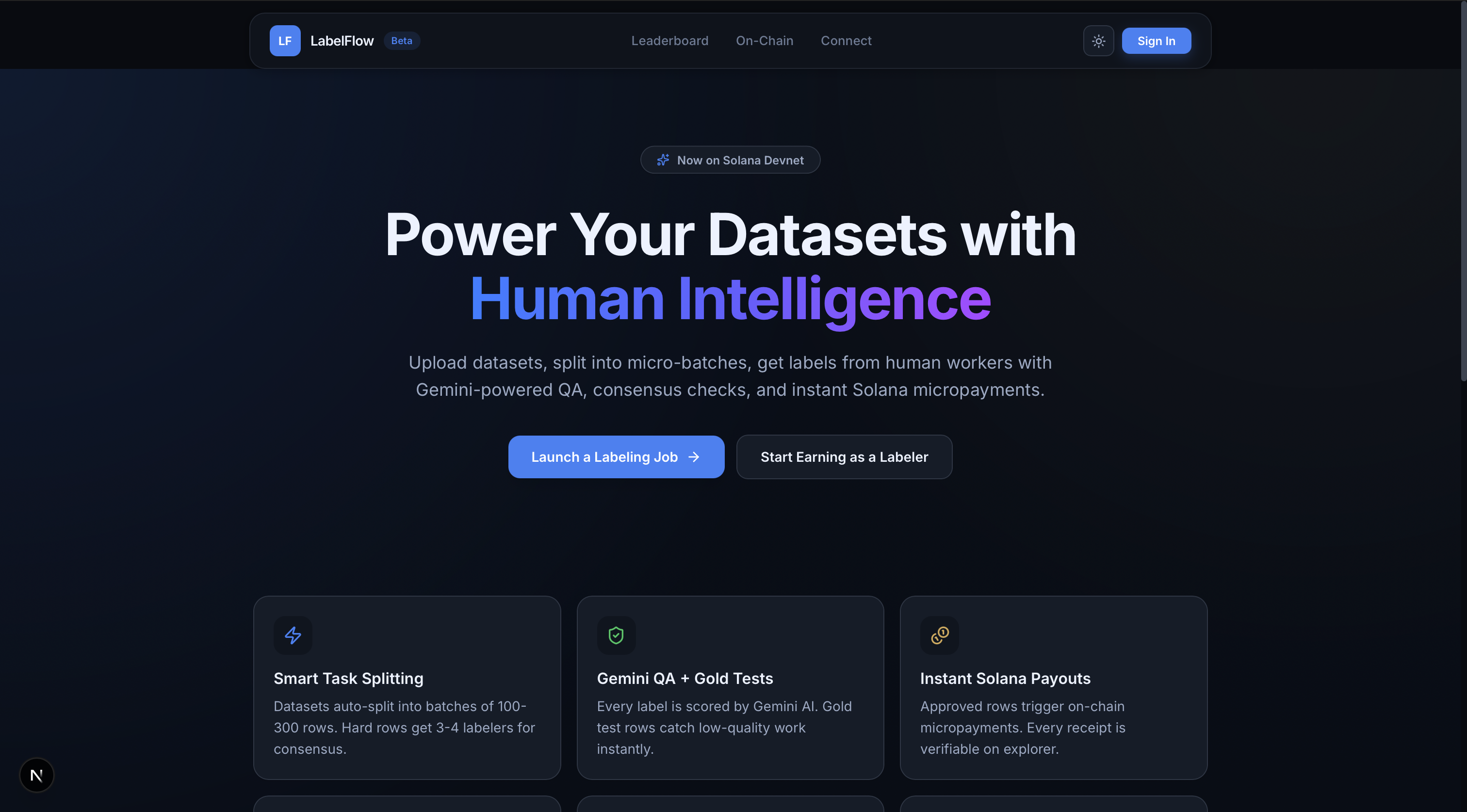 Data labeling today is slow, inconsistent, and often untrustworthy. AI models depend heavily on clean, high-quality labeled data, yet the current systems lack transparency and proper incentives for honest contributors. We were inspired to rethink this process. With SOLabel, labeling becomes transparent, AI-verified, and fairly rewarded through micropayments.