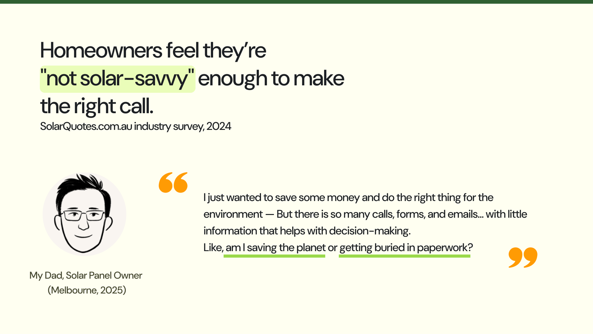 Over a 7-8 week period, he found himself juggling back-and-forth quote emails with sales reps, follow-up calls from installer companies, scattered inspection schedules, and outdated government portals. It was time and energy consuming. To validate this, I interviewed several homeowners who had gone through the installation process in the past three years, and a pattern emerged: the solar journey is fragmented and overwhelming for everyday users: