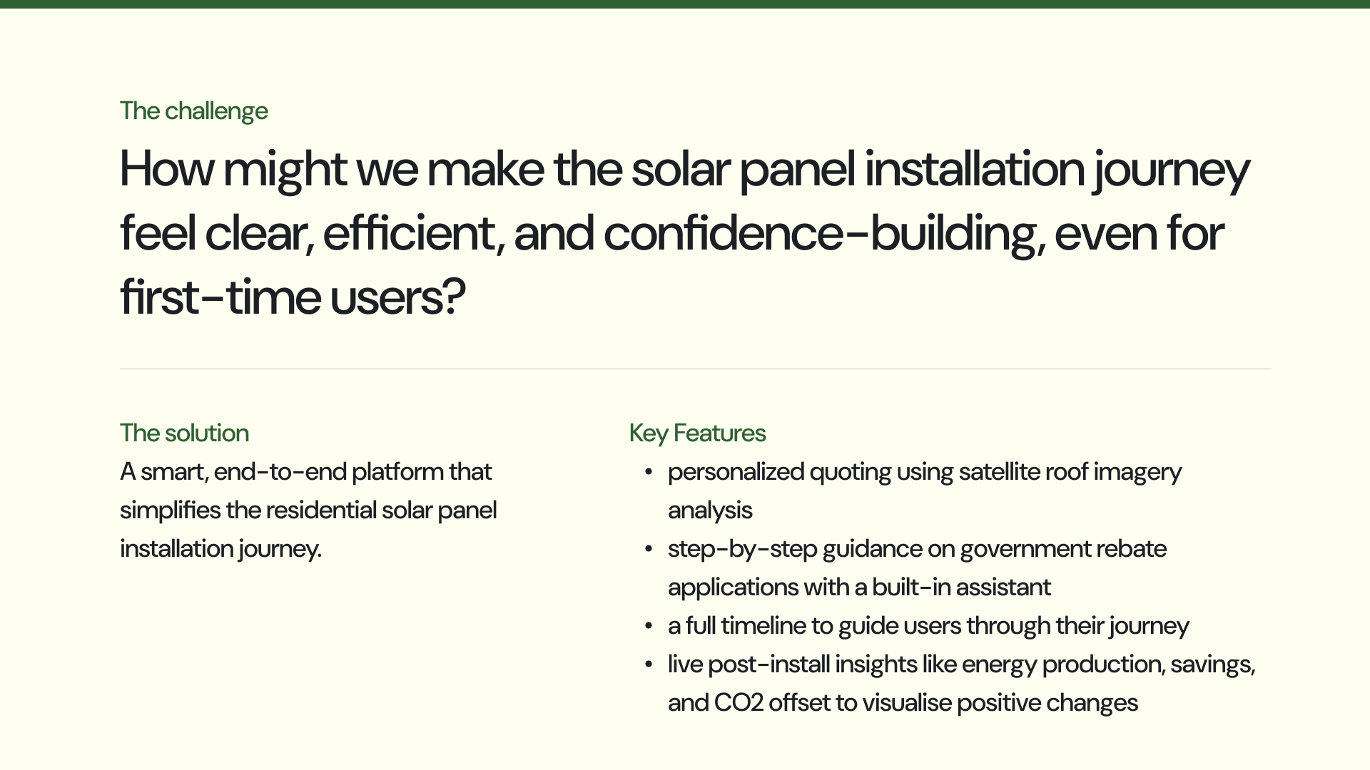 This project was inspired by my dad's own frustrating experience of getting solar panels installed on our roof back home in Australia. While government incentives like rebates exist to incentivize sustainable energy adoption, the actual process felt unnecessarily complicated, slow, and disconnected.