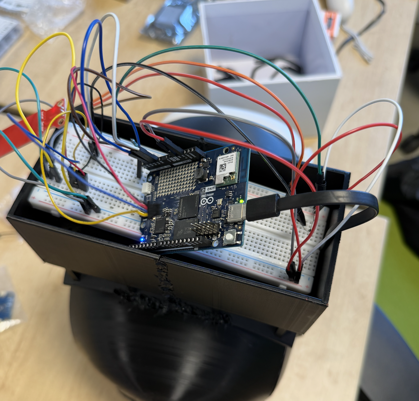 Serial doesn't work like a normal Arduino. Serial.println() on the UNO Q doesn't go to USB — it routes internally to the Qualcomm chip. We had to learn the Bridge RPC system (Bridge.provide() on the STM32 side, Bridge.call() on the Python side) before any sensor data was visible. The serial monitor in App Lab only shows 9600 baud and the output appears in the Python Shell tab, not the Serial Monitor tab.