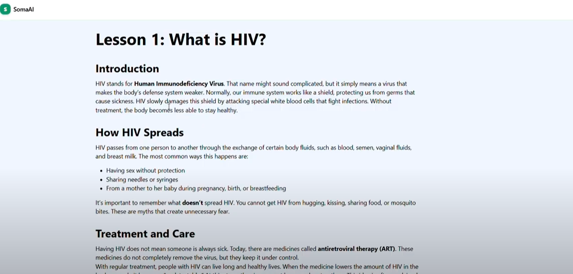 We plan to add a true offline mode so that the app is truly accessibly anywhere and everywhere, and we would like to turn SomaAI into a progressive web app that caches key FAQs and recent conversations. We would also like to make it more engaging through gamified quizzes and interactive features. Partnering with NGOs and schools will allow us to expand our reach and continue localizing the tool for different communities. We also would like to expand beyond sexual health, and also focus on areas in mental health.