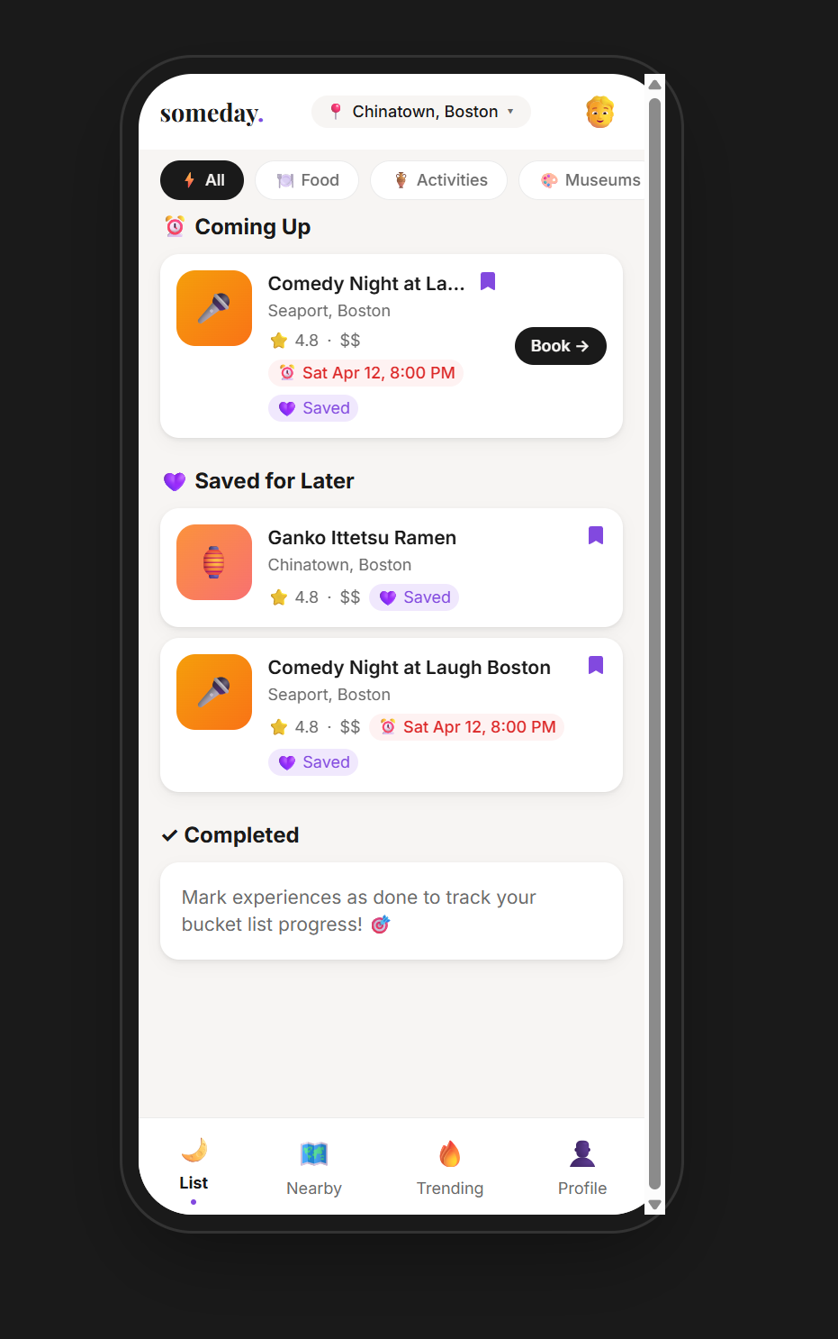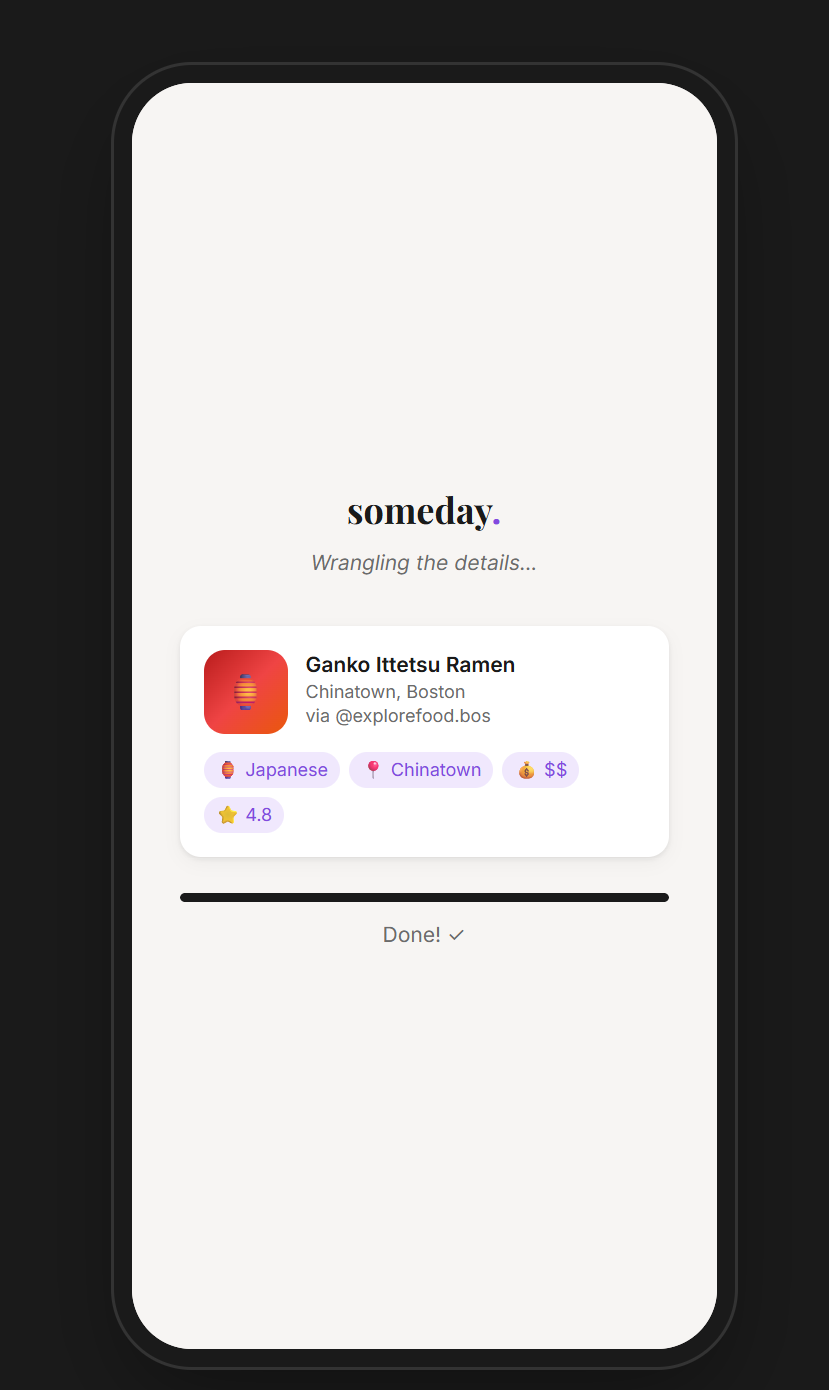 someday. is a personal bucket list app that turns your Instagram saves into bookable, actionable experiences.