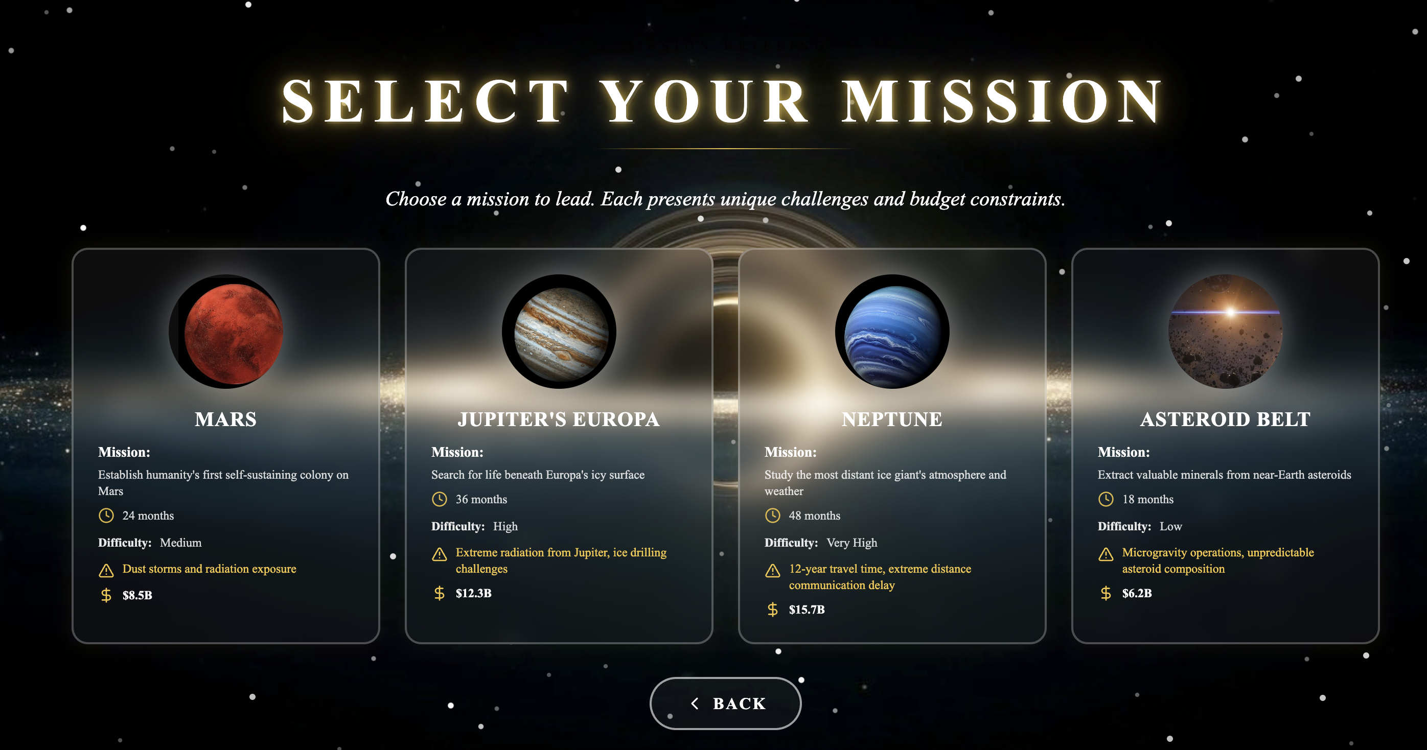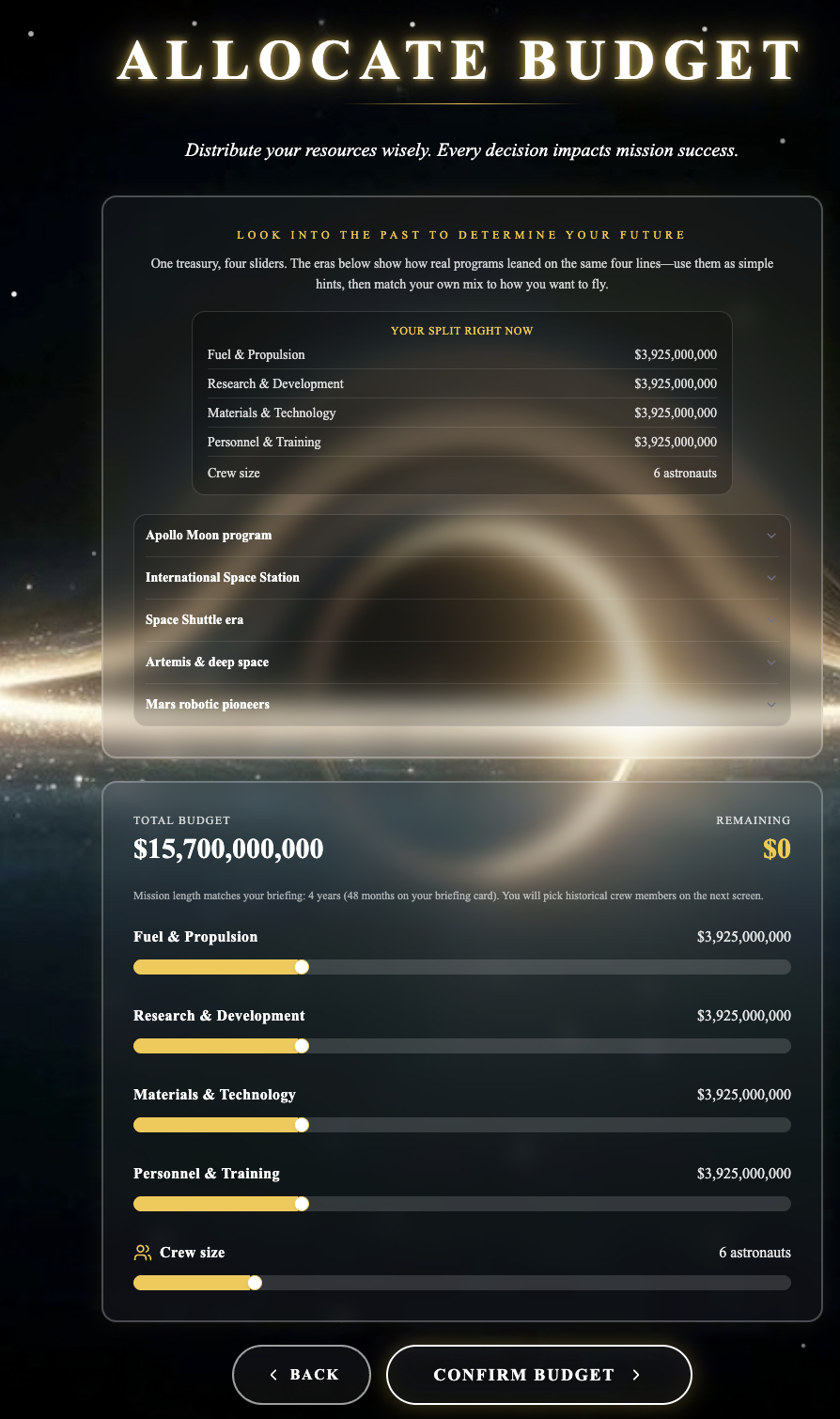 To improve the app, we plan to integrate an AI system that evaluates each mission's outcome based on the user's unique budget allocation, crew decisions, and real-time choices. This would replace the current rule-based logic with a model that draws on historical space mission data to deliver more nuanced, realistic, and personalized results.