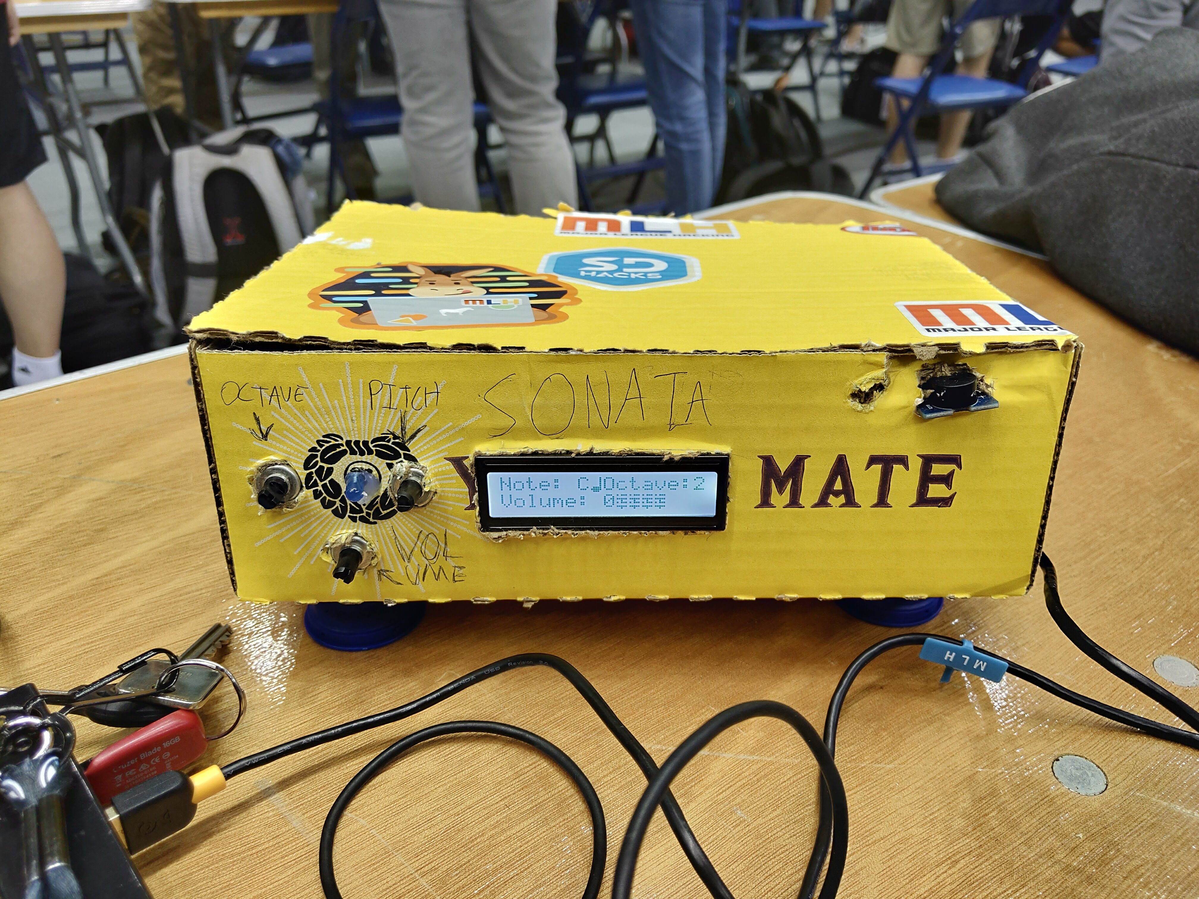 I grabbed electronic components one piece at a time and pieced it together over time. Every time I plugged in a component, I had another idea for a function that my project could have and went back and forth between the booth to grab more and more electronics. For the casing, I grabbed leftover Yerba Mate boxes to encase my project and give it a _ better _ look, rather than a skeleton of electronics. It also allowed me to place my knobs and buttons where I liked them so that it was easy to keep track of what each component does. For the coding section of this project, it was a matter of looking at libraries for the code and troubleshooting errors online and in the debug console.