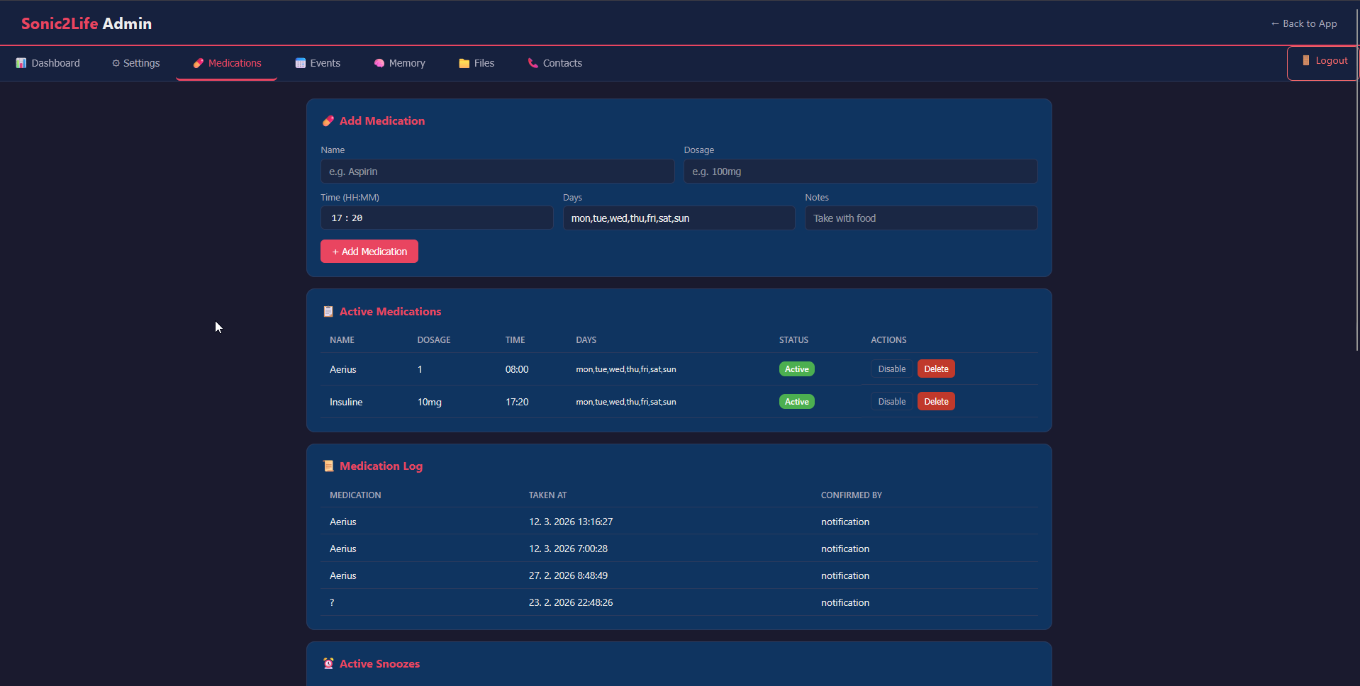 - Admin panel — full web dashboard for caregivers (family members) to manage medications, events, contacts, push subscriptions, notification history, and settings — without needing voice commands
