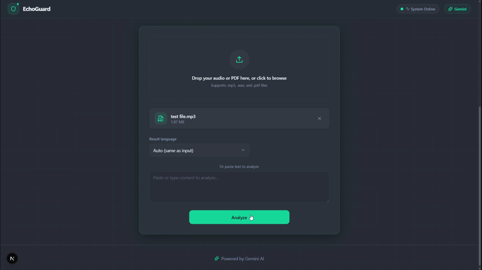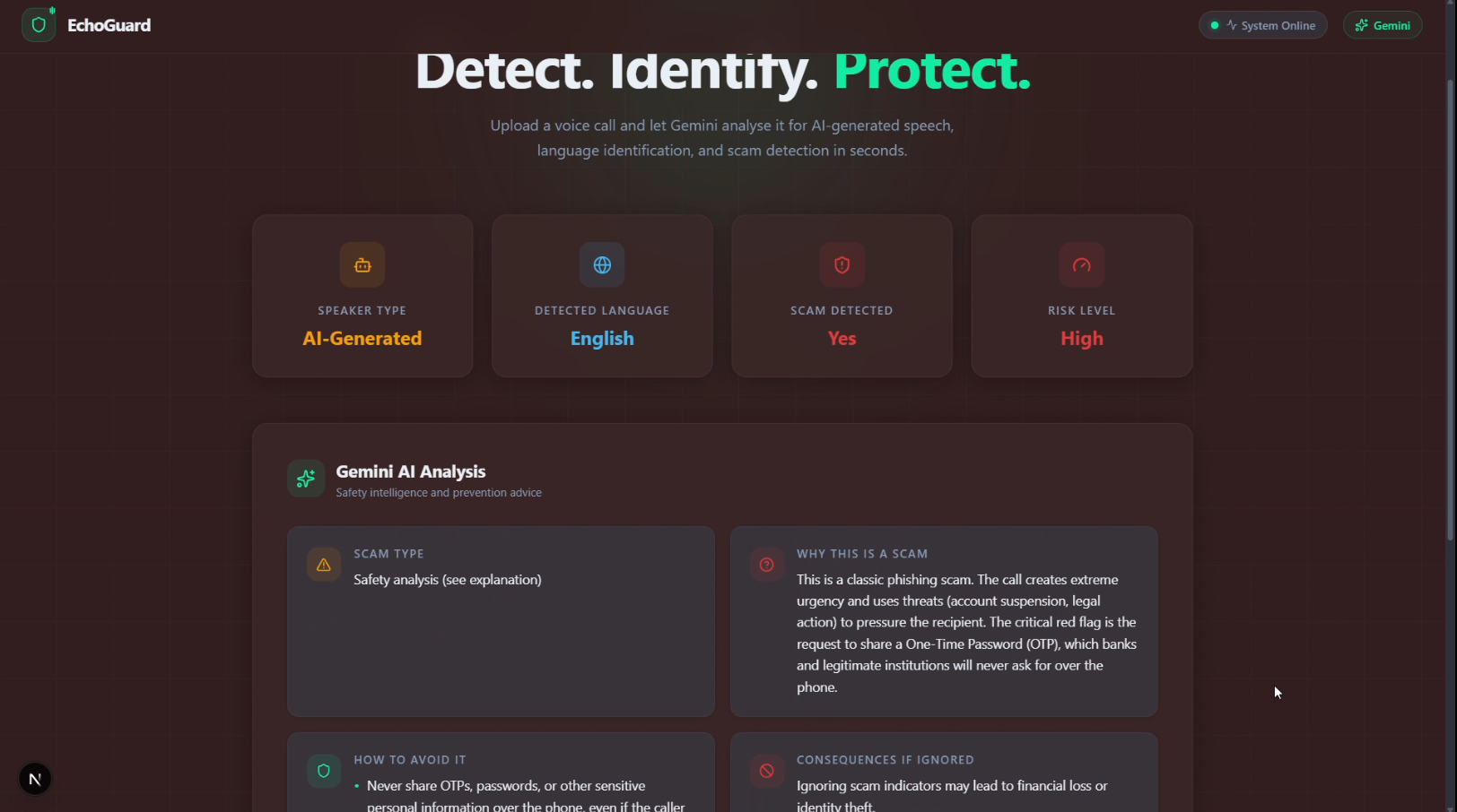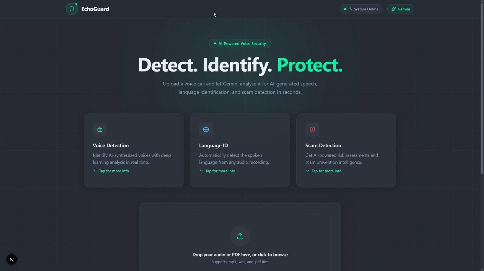 EchoGuard analyzes voice recordings and text messages using AI. Audio inputs are converted into text, and both audio-derived text and direct text inputs are examined to detect AI-generated content, identify language, and flag possible scam indicators. The system provides clear insights to help users make safer decisions.
