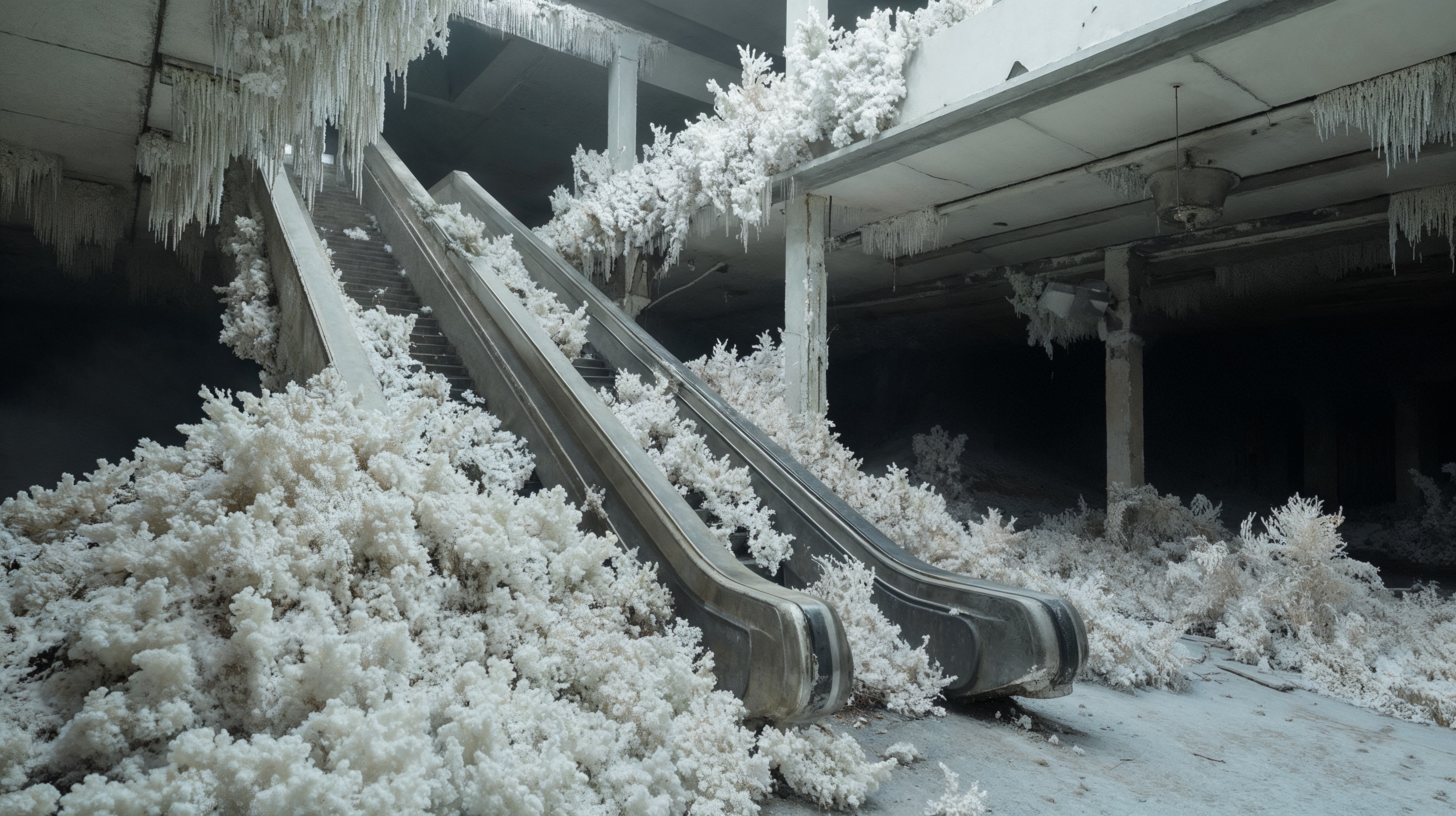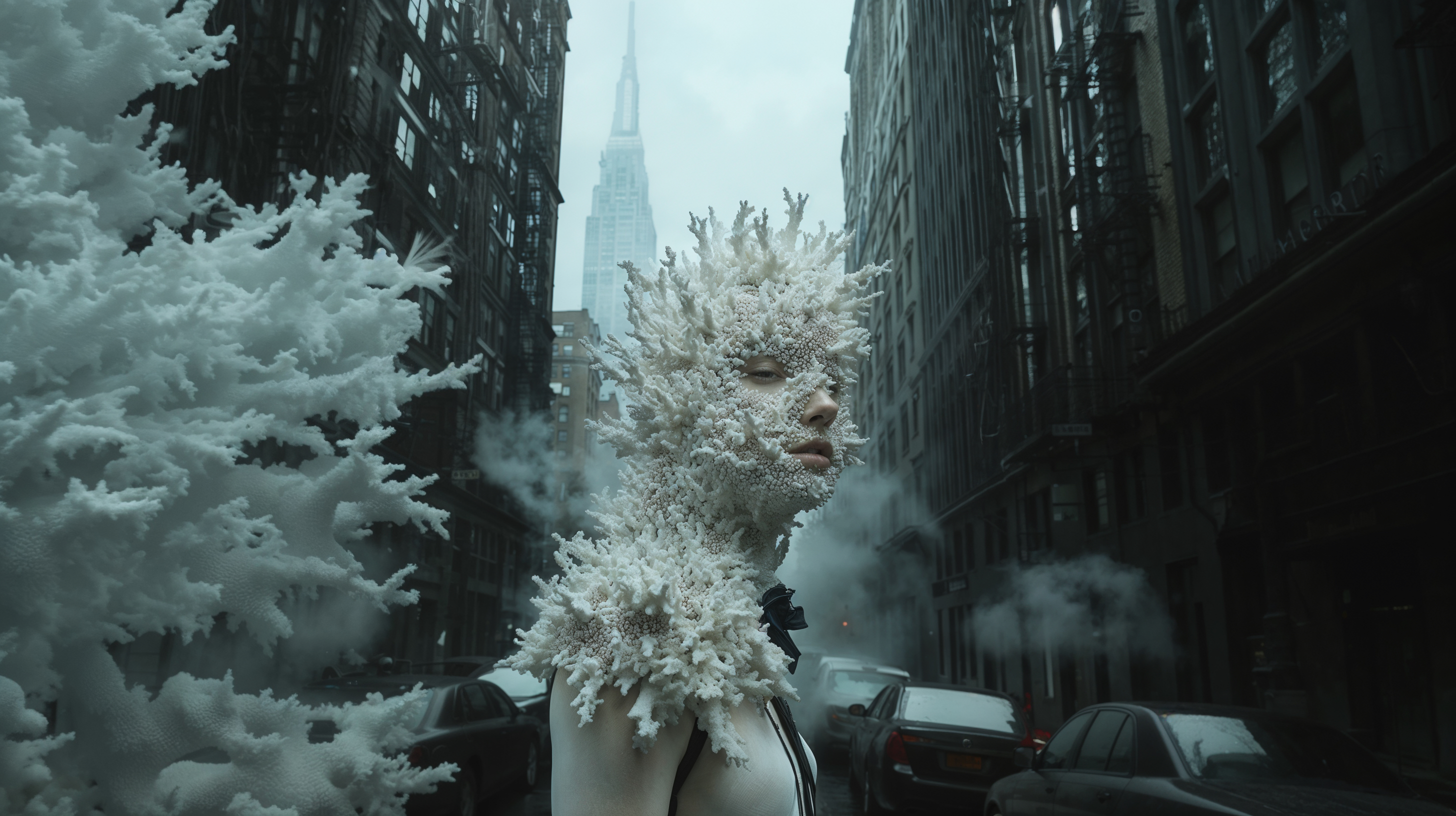 Post-life city.An urban landscape overtaken by white coral forms, as if life had changed shape and inhabited the ruins.
