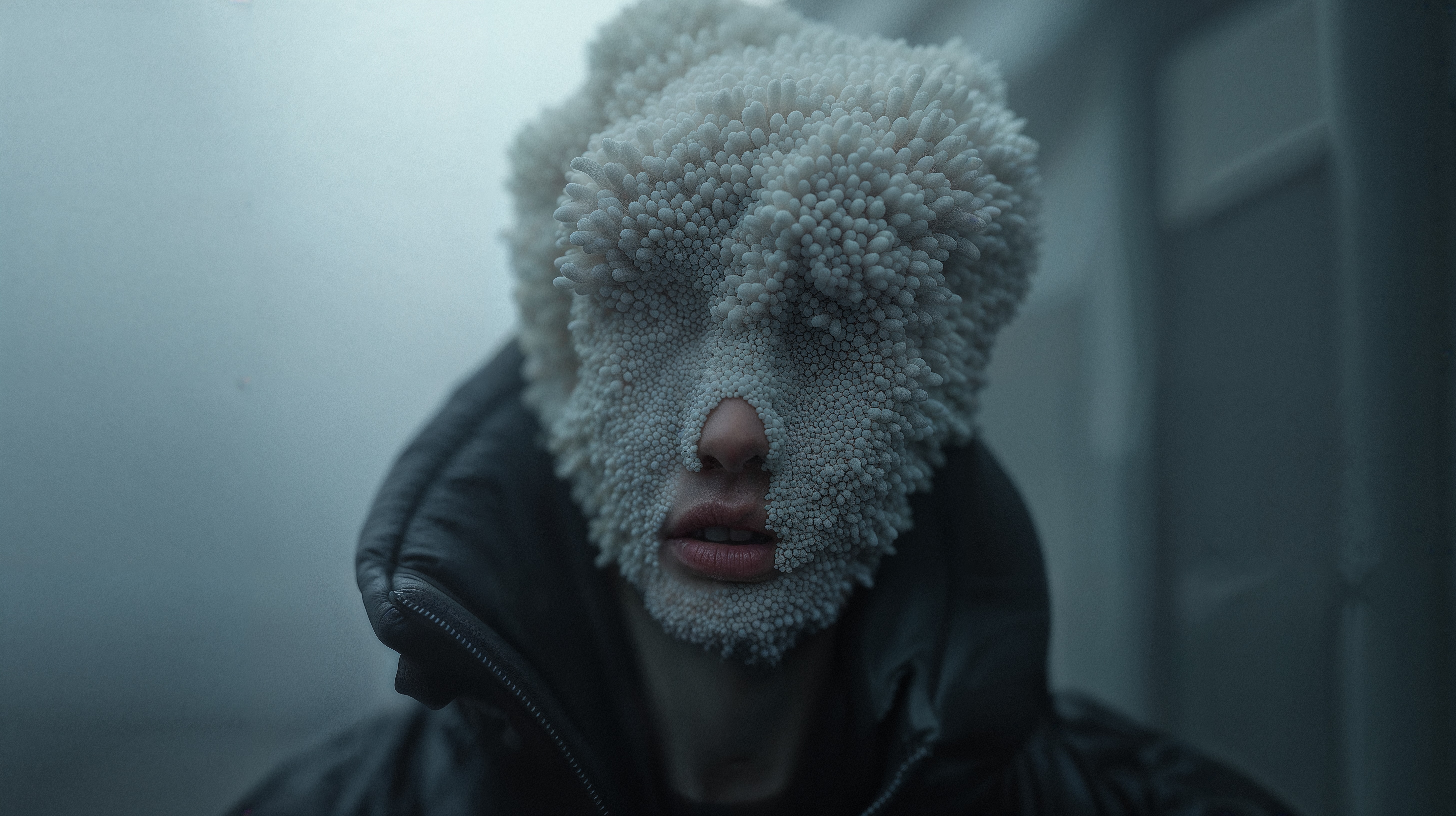 Entity in transition. A genderless figure crossing into a new universe, revealing a hybrid morphology between body and coral.