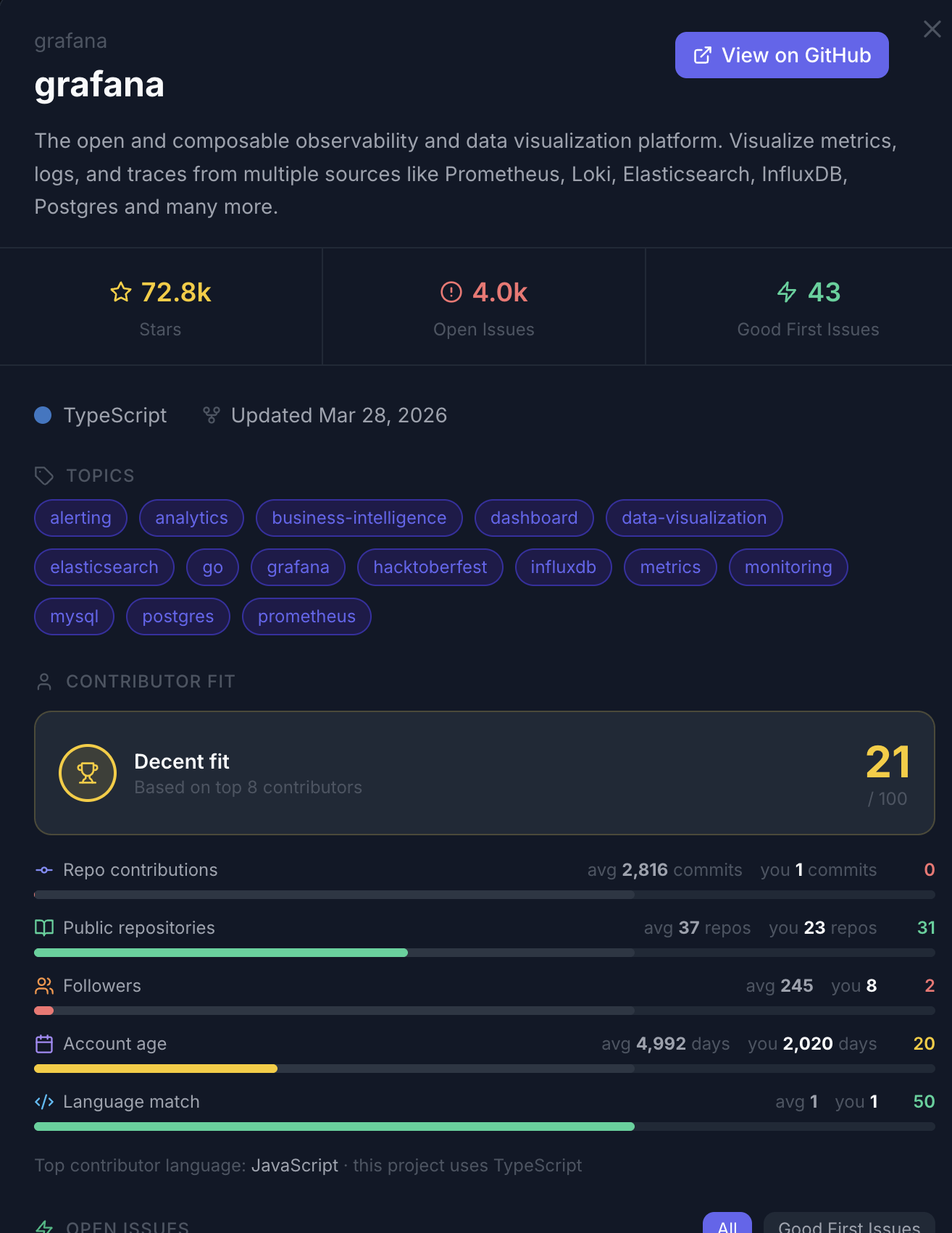 sopu matches contributors to relevant projects and “good first issues” based on their skills, interests, and project needs. It also provides guided onboarding, educational resources, and mentorship pathways to help contributors succeed. For maintainers, it streamlines contribution management and offers insights into project and community health.