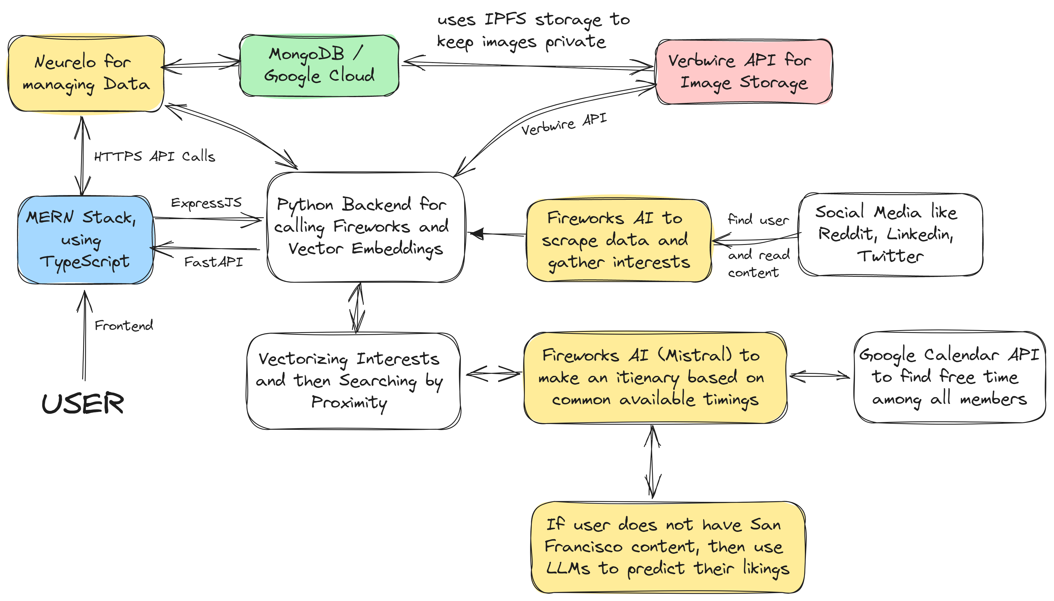 To avoid user getting bored of typing his/her/their information repeatedly, our webapp scrapes their existing social media data and find their common interests. Uses vector search to find people and friend groups similar to them in terms of interests and sports, and matches them up. Also makes hang out plans based on availability of the group.